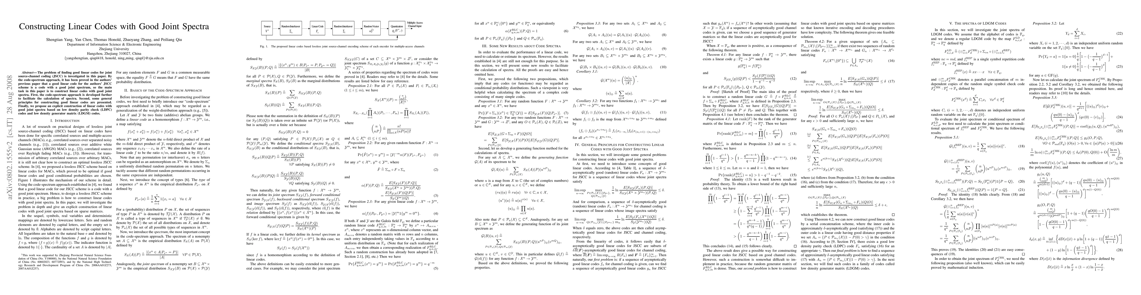 This paper investigates constructing linear codes for joint source-channel coding (JSCC) by focusing on codes with good joint spectra. It develops the code-spectrum approach further and presents principles for constructing such codes, ultimately proposing an explicit construction based on LDPC and LDGM codes.