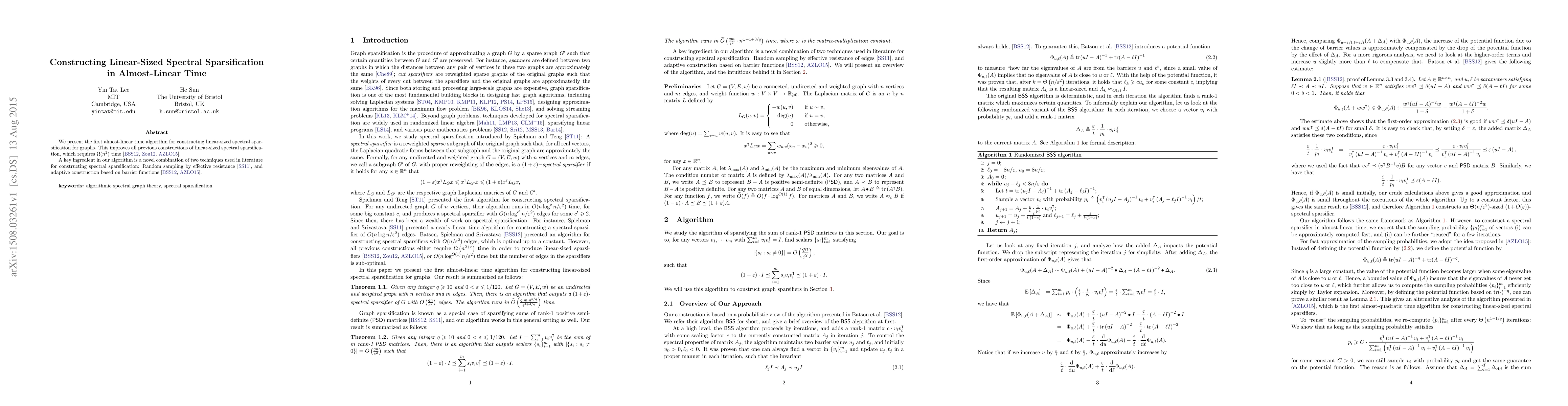 The paper presents an algorithm that constructs linear-sized spectral sparsification of graphs in almost-linear time, utilizing a novel combination of random sampling by effective resistance and adaptive constructions based on barrier functions.