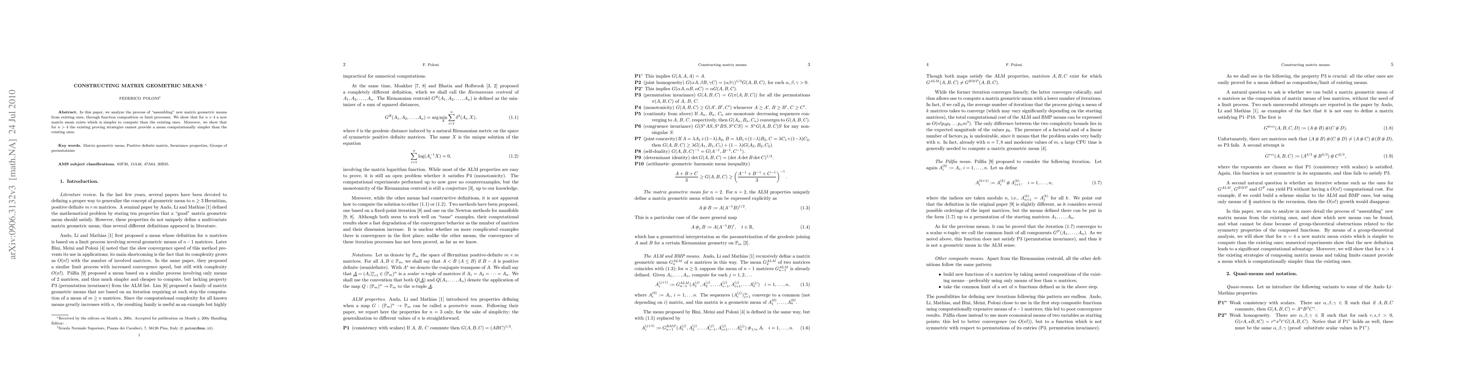 In this paper, we analyze the process of "assembling" new matrix geometric means from existing ones, through function composition or limit processes. We show that for n=4 a new matrix mean exists which is simpler to compute than the existing ones. Moreover, we show that for n>4 the existing proving strategies cannot provide a mean computationally simpler than the existing ones.