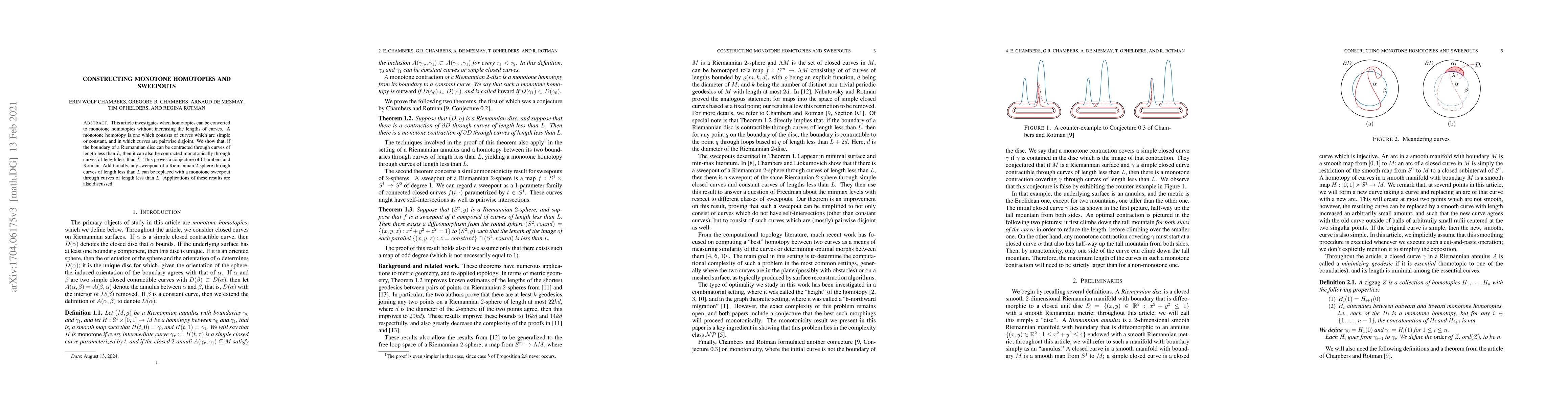 This paper proves that homotopies can be converted to monotone homotopies without increasing curve lengths, confirming a conjecture by Chambers and Rotman. It also demonstrates that any sweepout of a Riemannian 2-sphere can be replaced with a monotone sweepout without exceeding a given length threshold.