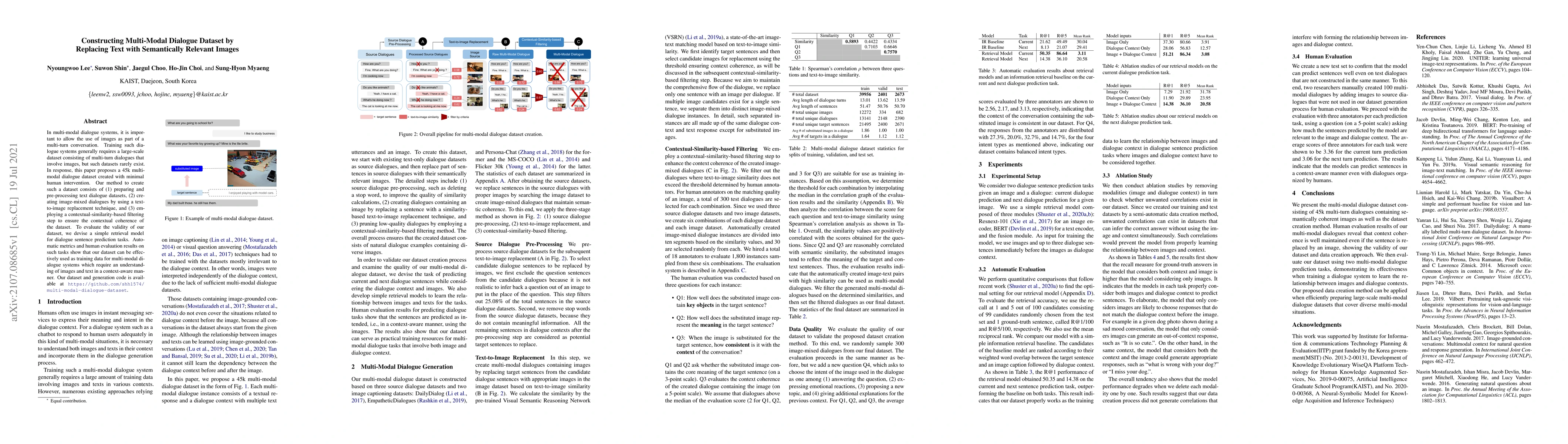 This paper introduces a 45k multi-modal dialogue dataset created by replacing text in existing dialogues with semantically relevant images, ensuring contextual coherence through filtering. The dataset is evaluated using a retrieval model, demonstrating its effectiveness for training multi-modal dialogue systems.