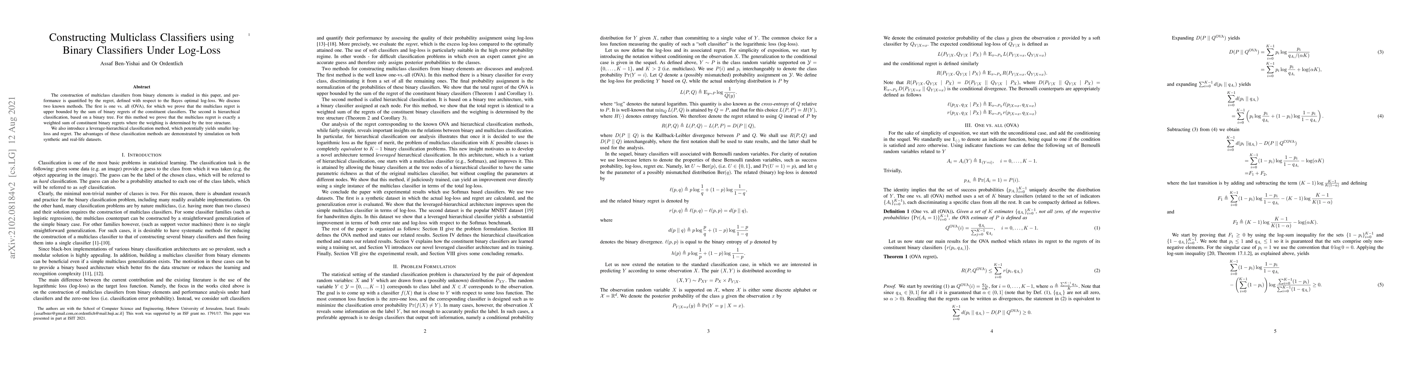 This paper explores constructing multiclass classifiers from binary classifiers under log-loss, analyzing two methods: one vs. all (OVA) and hierarchical classification. It introduces a leverage-hierarchical method potentially reducing log-loss and regret, demonstrated through simulations on synthetic and real datasets.