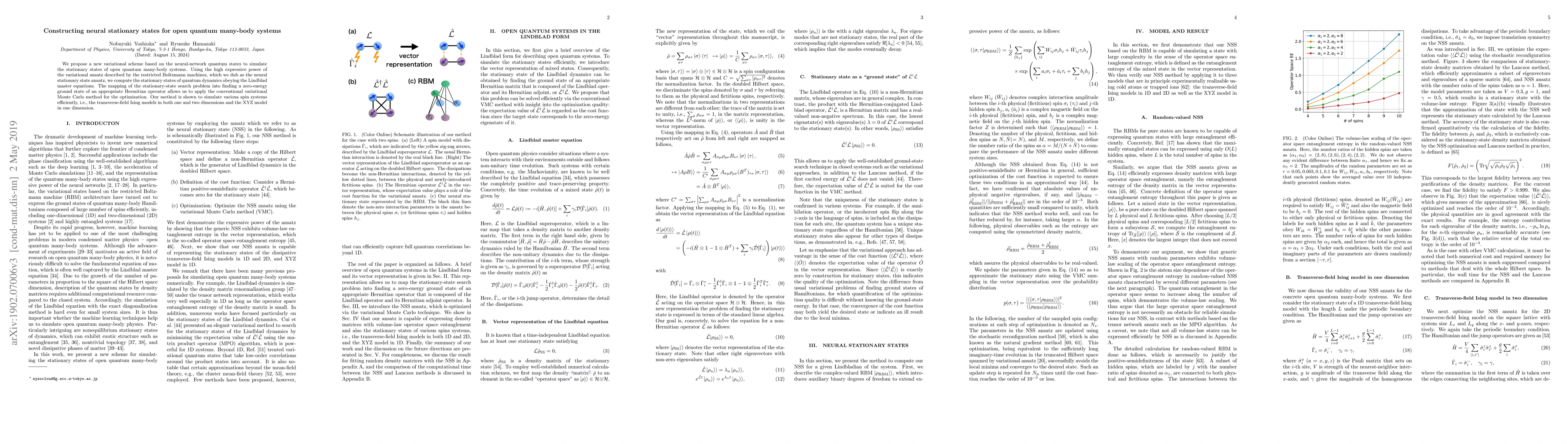 We propose a new variational scheme based on the neural-network quantum states to simulate the stationary states of open quantum many-body systems. Using the high expressive power of the variational ansatz described by the restricted Boltzmann machines, which we dub as the neural stationary state ansatz, we compute the stationary states of quantum dynamics obeying the Lindblad master equations. The mapping of the stationary-state search problem into finding a zero-energy ground state of an appropriate Hermitian operator allows us to apply the conventional variational Monte Carlo method for the optimization. Our method is shown to simulate various spin systems efficiently, i.e., the transverse-field Ising models in both one and two dimensions and the XYZ model in one dimension.