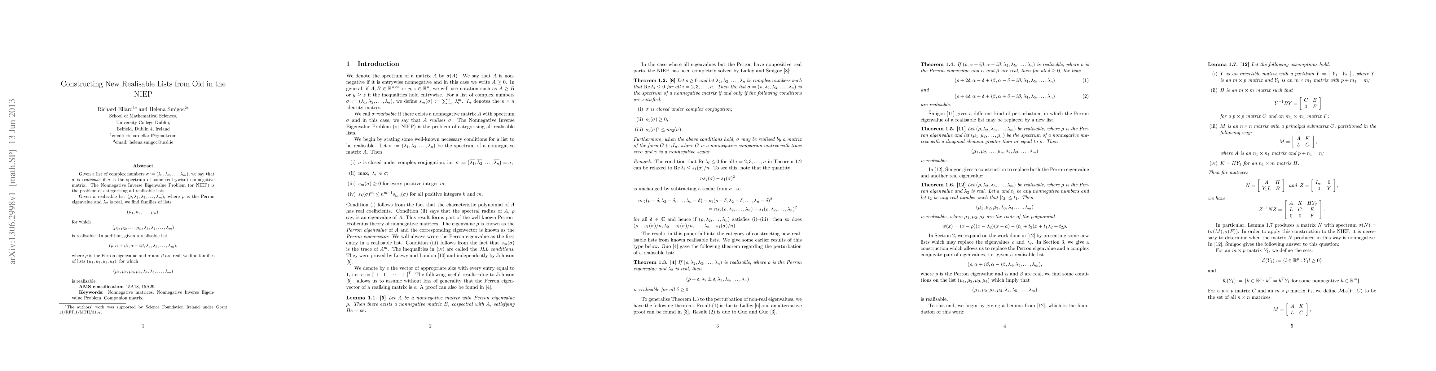 Given a list of complex numbers \sigma:=(\lambda_1,\lambda_2,...,\lambda_m), we say that {\sigma} is realisable if {\sigma} is the spectrum of some (entrywise) nonnegative matrix. The Nonnegative Inverse Eigenvalue Problem (or NIEP) is the problem of categorising all realisable lists. Given a realisable list (\rho,\lambda_2,\lambda_3,...,\lambda_m), where {\rho} is the Perron eigenvalue and \lambda_2 is real, we find families of lists (\mu_1,\mu_2,...,\mu_n), for which (\mu_1,\mu_2,...,\mu_n,\lambda_3,\lambda_4,...,\lambda_m) is realisable. In addition, given a realisable list (\rho,\alpha+i\beta,\alpha-i\beta,\lambda_4,\lambda_5,...,\lambda_m), where {\rho} is the Perron eigenvalue and {\alpha} and {\beta} are real, we find families of lists (\mu_1,\mu_2,\mu_3,\mu_4), for which (\mu_1,\mu_2,\mu_3,\mu_4,\lambda_4,\lambda_5,...,\lambda_m) is realisable.