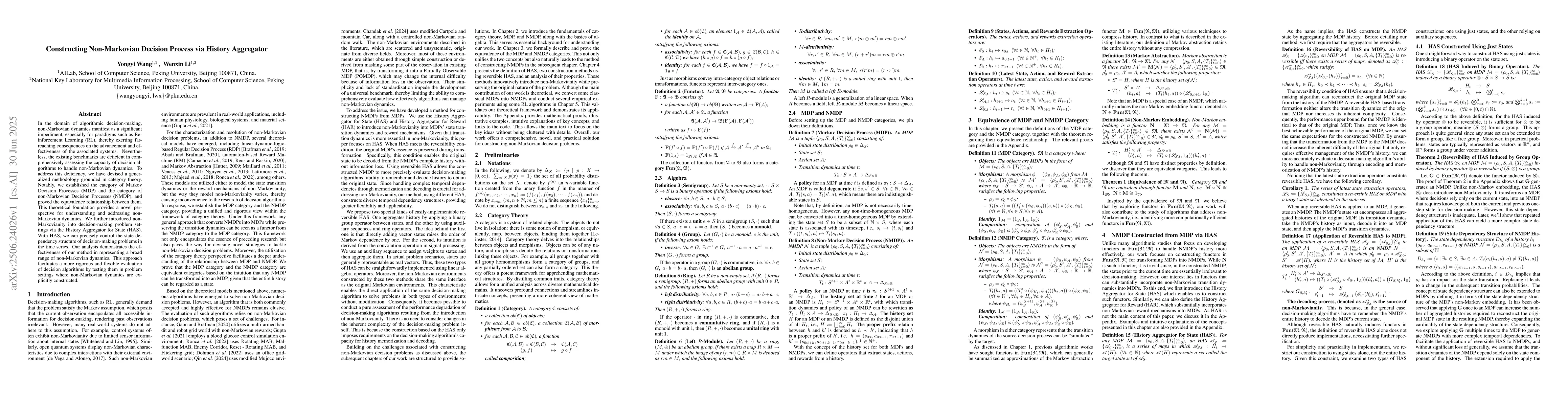 In the domain of algorithmic decision-making, non-Markovian dynamics manifest as a significant impediment, especially for paradigms such as Reinforcement Learning (RL), thereby exerting far-reaching consequences on the advancement and effectiveness of the associated systems. Nevertheless, the existing benchmarks are deficient in comprehensively assessing the capacity of decision algorithms to handle non-Markovian dynamics. To address this deficiency, we have devised a generalized methodology grounded in category theory. Notably, we established the category of Markov Decision Processes (MDP) and the category of non-Markovian Decision Processes (NMDP), and proved the equivalence relationship between them. This theoretical foundation provides a novel perspective for understanding and addressing non-Markovian dynamics. We further introduced non-Markovianity into decision-making problem settings via the History Aggregator for State (HAS). With HAS, we can precisely control the state dependency structure of decision-making problems in the time series. Our analysis demonstrates the effectiveness of our method in representing a broad range of non-Markovian dynamics. This approach facilitates a more rigorous and flexible evaluation of decision algorithms by testing them in problem settings where non-Markovian dynamics are explicitly constructed.