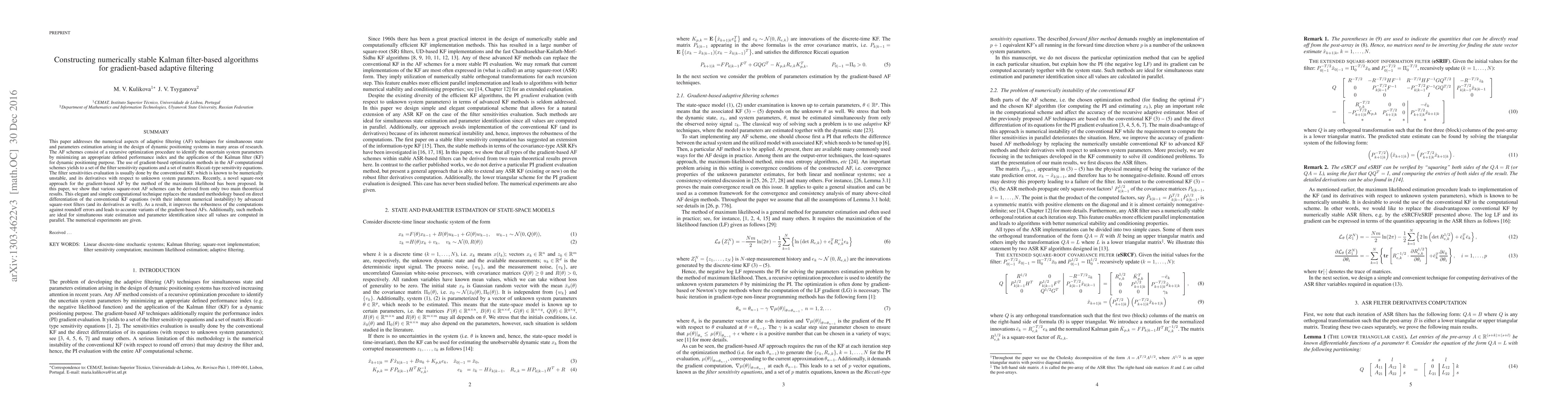 This paper addresses the numerical aspects of adaptive filtering (AF) techniques for simultaneous state and parameters estimation arising in the design of dynamic positioning systems in many areas of research. The AF schemes consist of a recursive optimization procedure to identify the uncertain system parameters by minimizing an appropriate defined performance index and the application of the Kalman filter (KF) for dynamic positioning purpose. The use of gradient-based optimization methods in the AF computational schemes yields to a set of the filter sensitivity equations and a set of matrix Riccati-type sensitivity equations. The filter sensitivities evaluation is usually done by the conventional KF, which is known to be numerically unstable, and its derivatives with respect to unknown system parameters. Recently, a novel square-root approach for the gradient-based AF by the method of the maximum likelihood has been proposed. In this paper, we show that various square-root AF schemes can be derived from only two main theoretical results. This elegant and simple computational technique replaces the standard methodology based on direct differentiation of the conventional KF equations (with their inherent numerical instability) by advanced square-root filters (and its derivatives as well). As a result, it improves the robustness of the computations against roundoff errors and leads to accurate variants of the gradient-based AFs. Additionally, such methods are ideal for simultaneous state estimation and parameter identification since all values are computed in parallel. The numerical experiments are given.