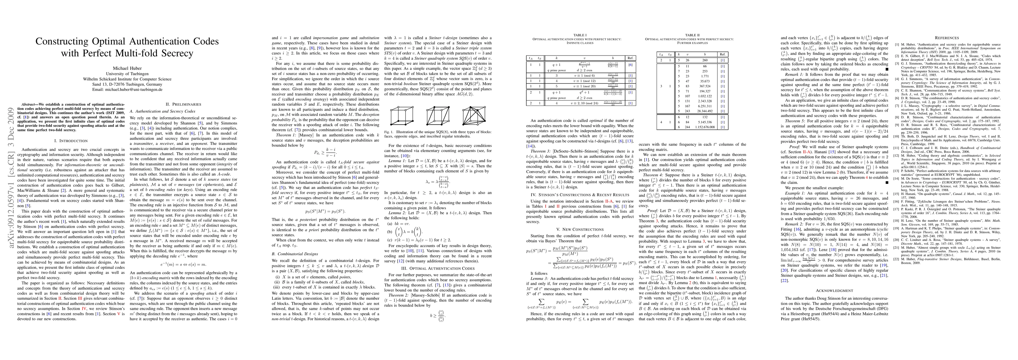 The paper introduces a novel method to construct optimal authentication codes using combinatorial designs, ensuring both perfect multi-fold secrecy and security against spoofing attacks.