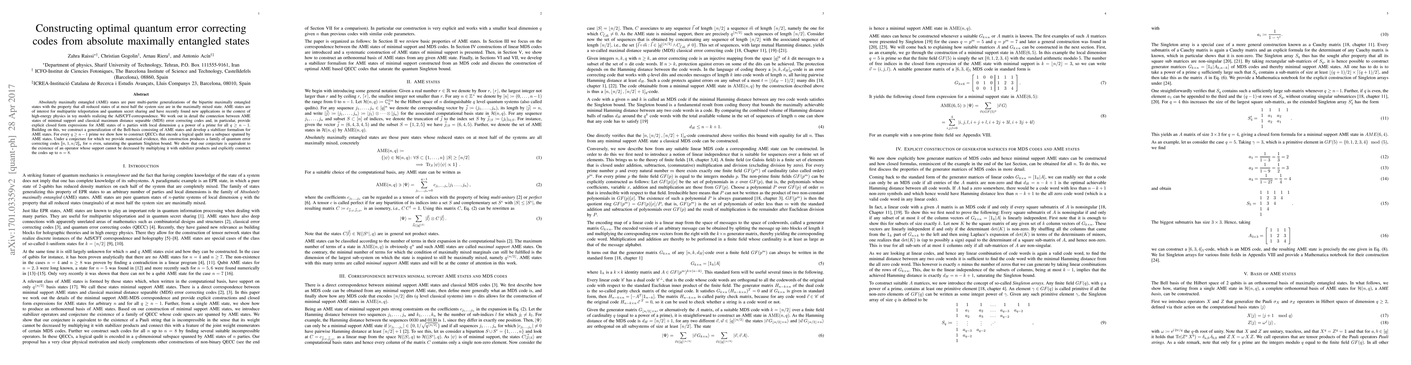 This paper explores the construction of optimal quantum error-correcting codes (QECCs) using absolutely maximally entangled (AME) states, which generalize maximally entangled states. It establishes a connection between AME states and classical maximum distance separable (MDS) codes, and constructs QECCs that achieve the quantum Singleton bound under a conjecture supported by numerical evidence.