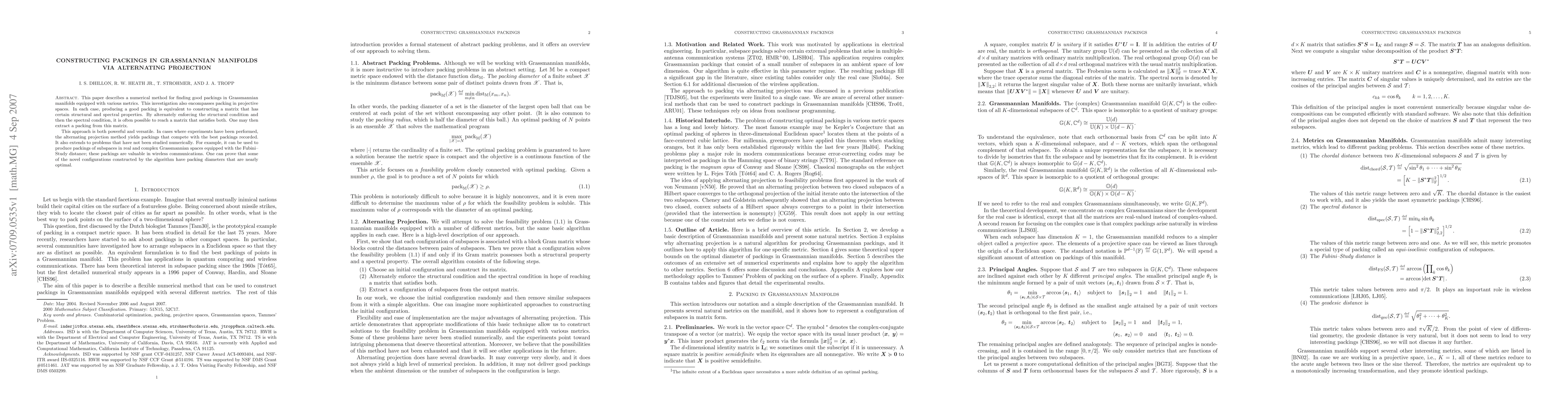This paper presents a numerical method for constructing optimal packings in Grassmannian manifolds via alternating projection, which alternates between enforcing structural and spectral conditions to achieve matrices with desirable properties. The method is shown to yield competitive packings and extends to new problems, including subspace packings in wireless communications.