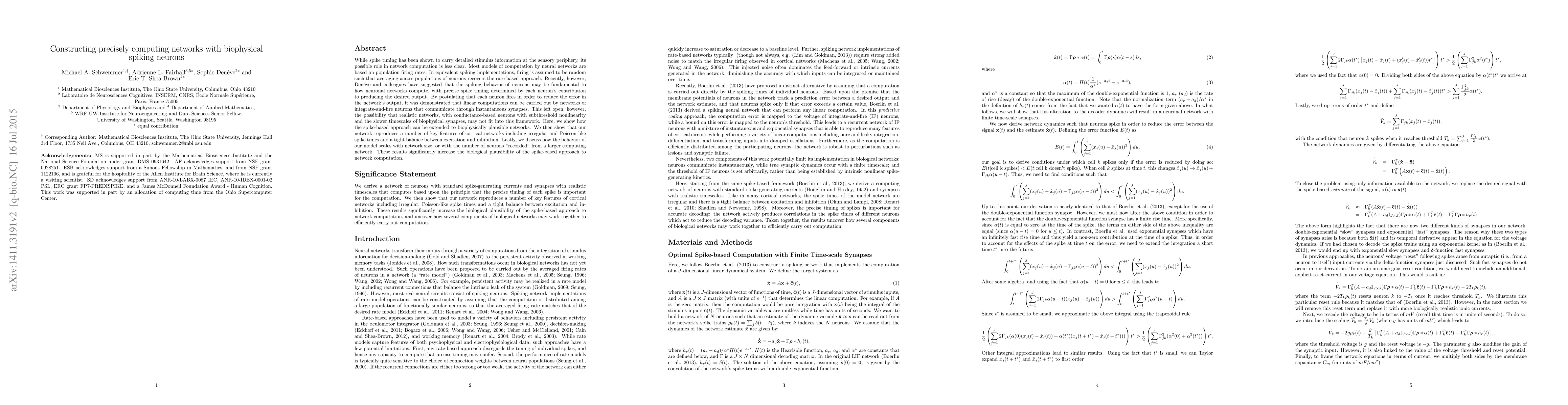 This paper extends the spike-based approach to neural computation to biophysically plausible networks, demonstrating that precise spike timing can enable linear computations in networks of biophysical spiking neurons with realistic synaptic dynamics. The model reproduces key features of cortical networks and scales well with network size.