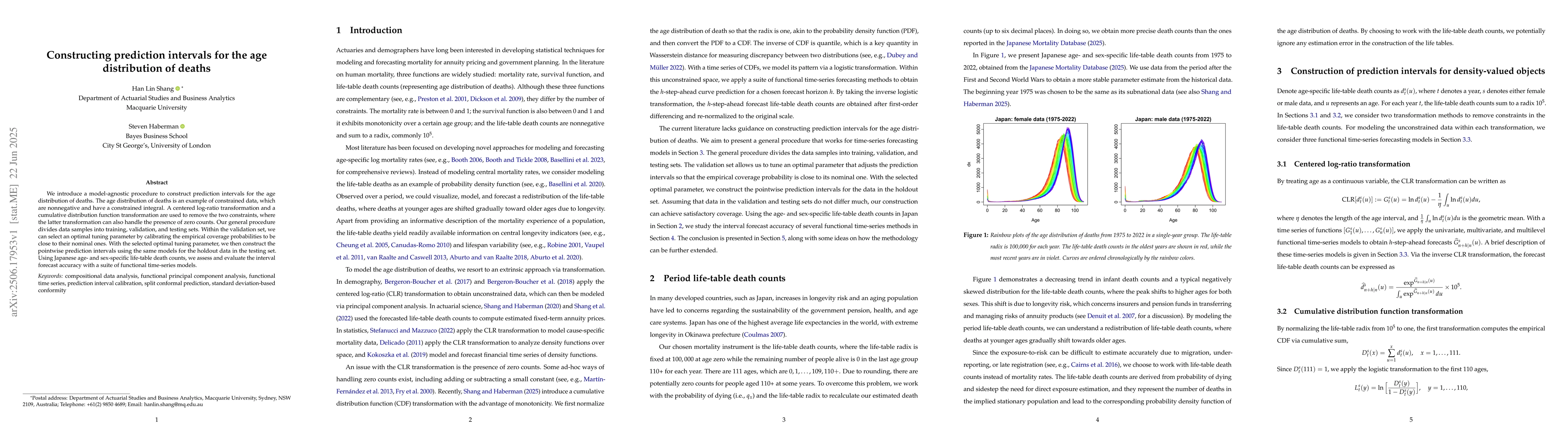 We introduce a model-agnostic procedure to construct prediction intervals for the age distribution of deaths. The age distribution of deaths is an example of constrained data, which are nonnegative and have a constrained integral. A centered log-ratio transformation and a cumulative distribution function transformation are used to remove the two constraints, where the latter transformation can also handle the presence of zero counts. Our general procedure divides data samples into training, validation, and testing sets. Within the validation set, we can select an optimal tuning parameter by calibrating the empirical coverage probabilities to be close to their nominal ones. With the selected optimal tuning parameter, we then construct the pointwise prediction intervals using the same models for the holdout data in the testing set. Using Japanese age- and sex-specific life-table death counts, we assess and evaluate the interval forecast accuracy with a suite of functional time-series models.