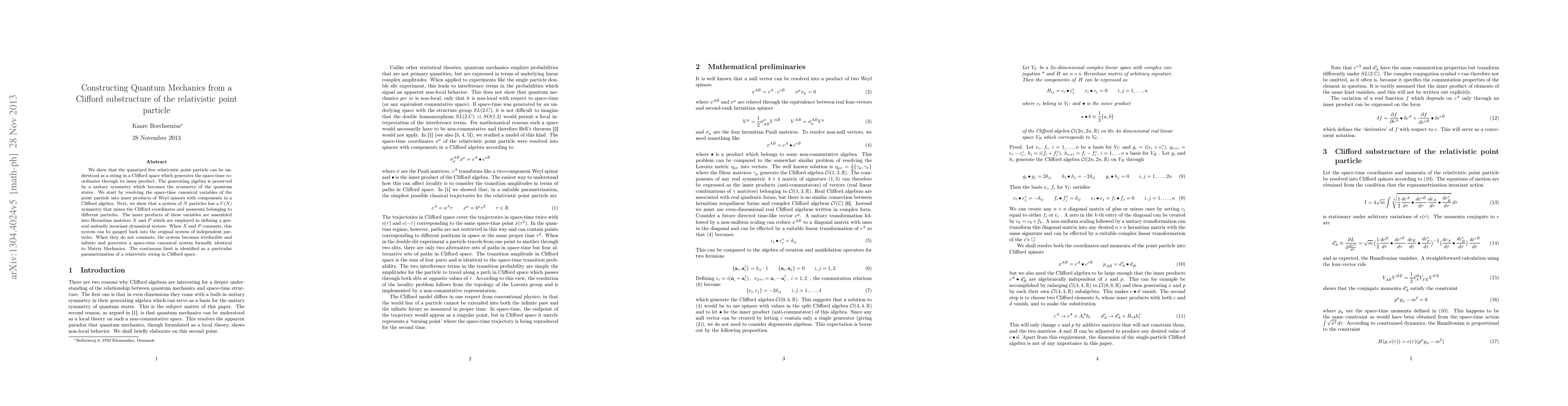 This paper constructs quantum mechanics by interpreting the quantized free relativistic point particle as a string in a Clifford space, where the space-time coordinates emerge from its inner product. It reveals a unitary symmetry that preserves the generating algebra and leads to a U(N) symmetry for N particles, ultimately identifying the continuum limit as a relativistic string in Clifford space.