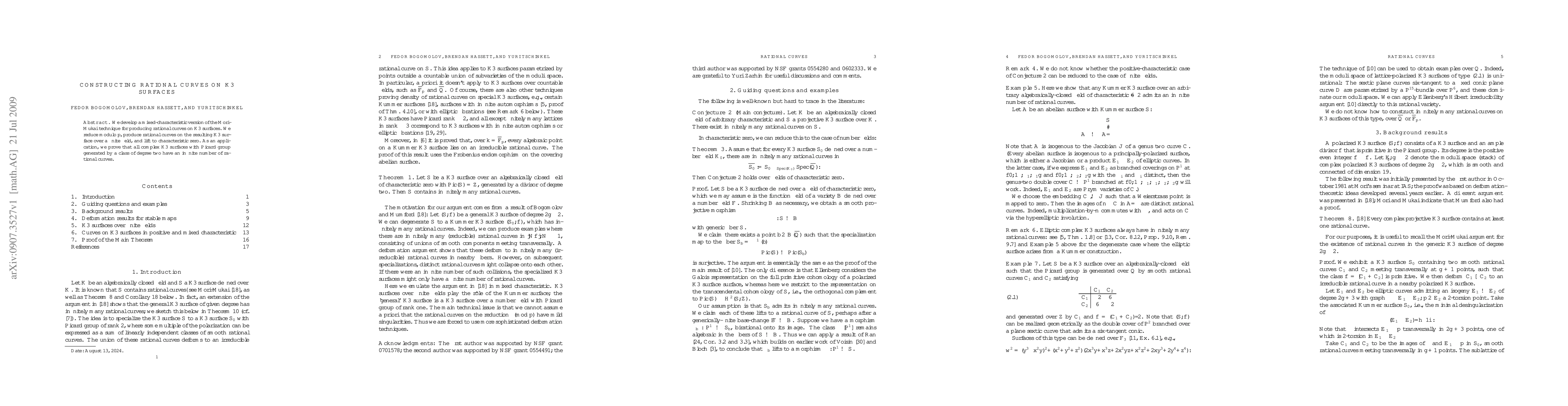 Summary: This paper introduces a mixed-characteristic method for generating rational curves on K3 surfaces by reducing modulo p, constructing curves over finite fields, and lifting them back to characteristic zero. It demonstrates that complex K3 surfaces with a Picard group generated by a degree two class possess an infinite number of rational curves.