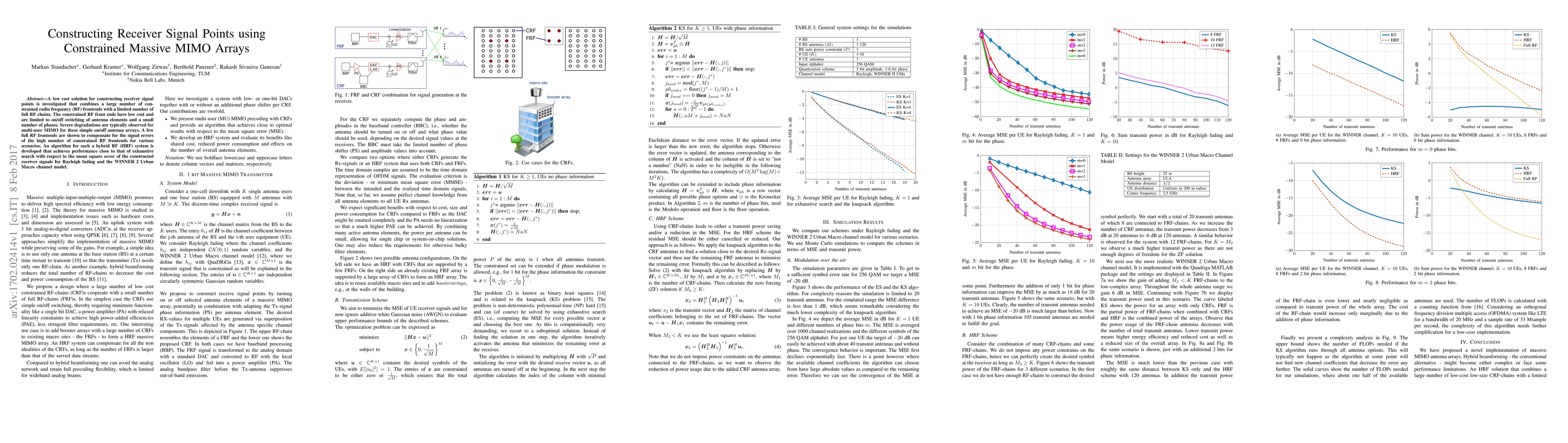 A low cost solution for constructing receiver signal points is investigated that combines a large number of constrained radio frequency (RF) frontends with a limited number of full RF chains. The constrained RF front ends have low cost and are limited to on/off switching of antenna elements and a small number of phases. Severe degradations are typically observed for multi-user MIMO for these simple on/off antenna arrays. A few full RF frontends are shown to compensate for the signal errors of the high number of constrained RF frontends for various scenarios. An algorithm for such a hybrid RF (HRF) system is developed that achieves performance close to that of exhaustive search with respect to the mean square error of the constructed receiver signals for Rayleigh fading and the WINNER 2 Urban Macro channel model.