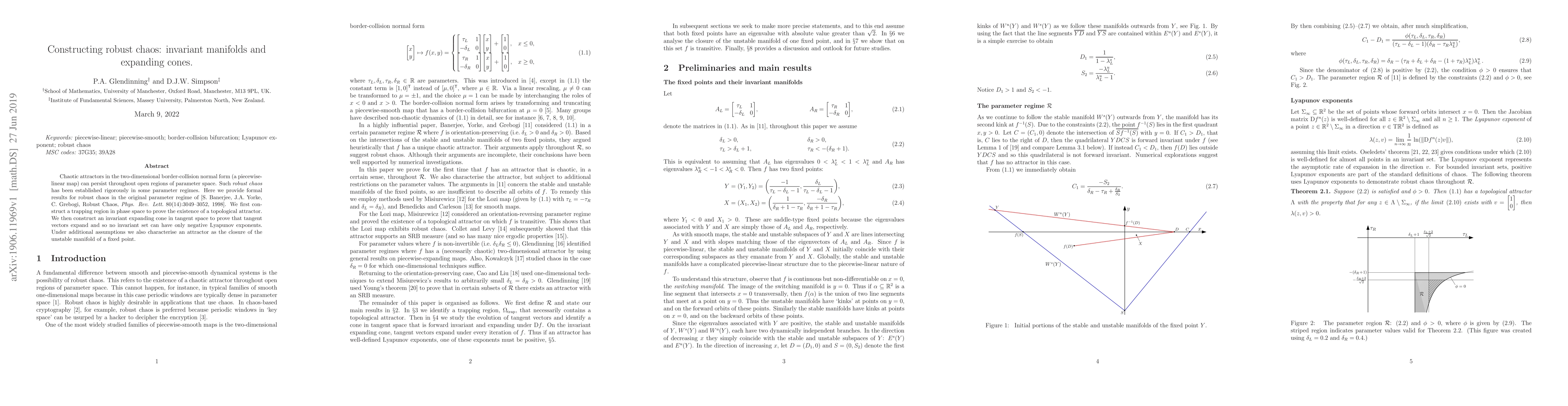 Chaotic attractors in the two-dimensional border-collision normal form (a piecewise-linear map) can persist throughout open regions of parameter space. Such robust chaos has been established rigorously in some parameter regimes. Here we provide formal results for robust chaos in the original parameter regime of [S. Banerjee, J.A. Yorke, C. Grebogi, Robust Chaos, Phys. Rev. Lett. 80(14):3049--3052, 1998]. We first construct a trapping region in phase space to prove the existence of a topological attractor. We then construct an invariant expanding cone in tangent space to prove that tangent vectors expand and so no invariant set can have only negative Lyapunov exponents. Under additional assumptions we also characterise an attractor as the closure of the unstable manifold of a fixed point.