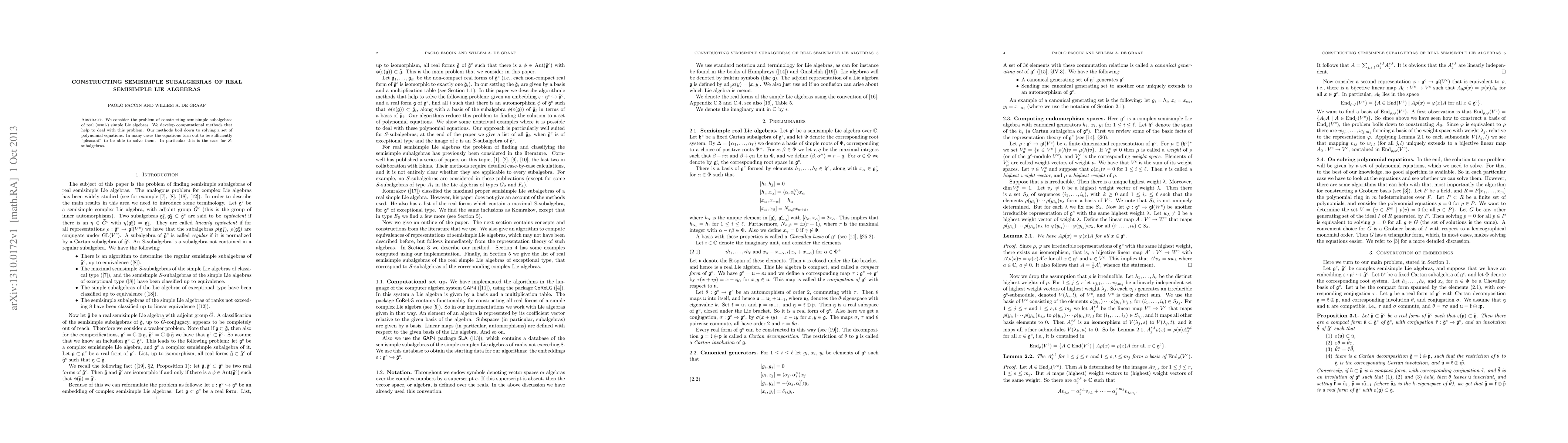 This paper develops computational methods for constructing semisimple subalgebras within real semisimple Lie algebras by solving polynomial equations, focusing on the particularly tractable case of S-subalgebras. The techniques provide effective solutions for many instances.