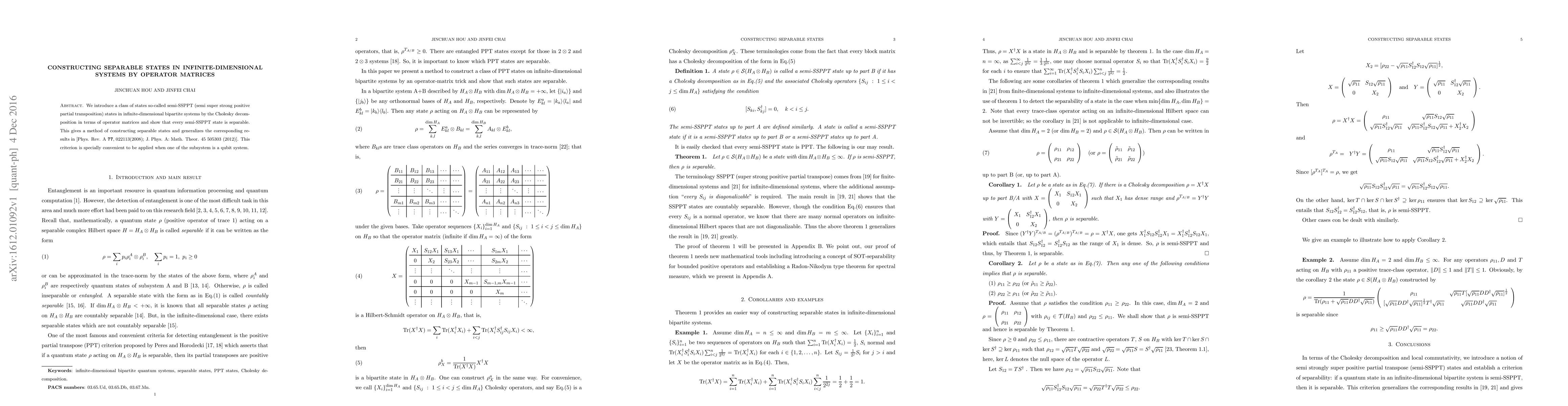 We introduce a class of states so-called semi-SSPPT (semi super strong positive partial transposition) states in infinite-dimensional bipartite systems by the Cholesky decomposition in terms of operator matrices and show that every semi-SSPPT state is separable. This gives a method of constructing separable states and generalizes the corresponding results in [Phys. Rev. A \textbf{77}, 022113(2008), J. Phys. A: Math. Theor. 45 505303 (2012)]. This criterion is specially convenient to be applied when one of the subsystem is a qubit system.