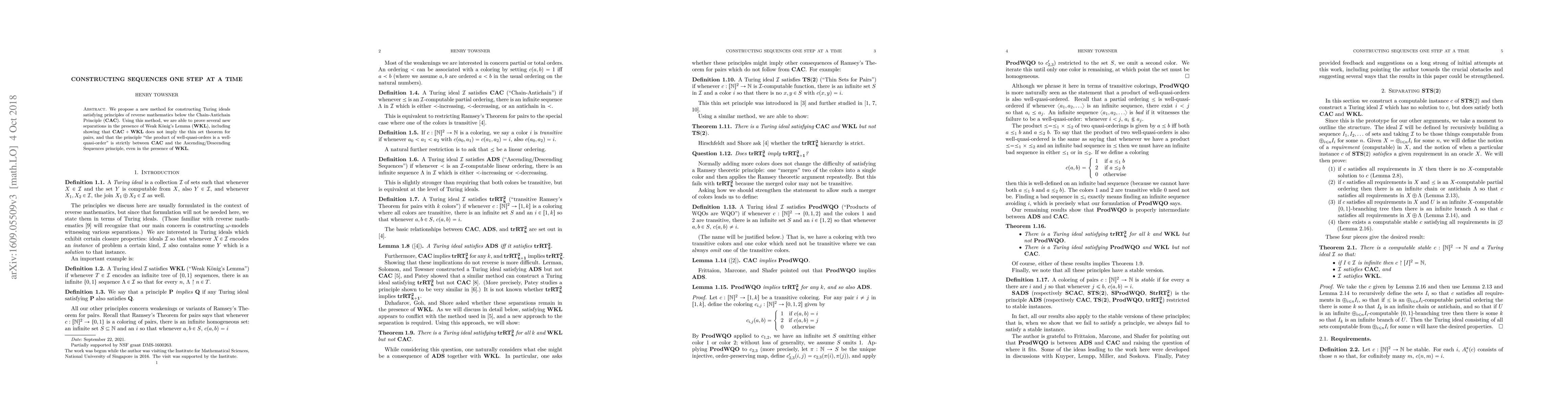 We propose a new method for constructing Turing ideals satisfying principles of reverse mathematics below the Chain-Antichain Principle (CAC). Using this method, we are able to prove several new separations in the presence of Weak Konig's Lemma (WKL), including showing that CAC+WKL does not imply the thin set theorem for pairs, and that the principle "the product of well-quasi-orders is a well-quasi-order" is strictly between CAC and the Ascending/Descending Sequences principle, even in the presence of WKL.