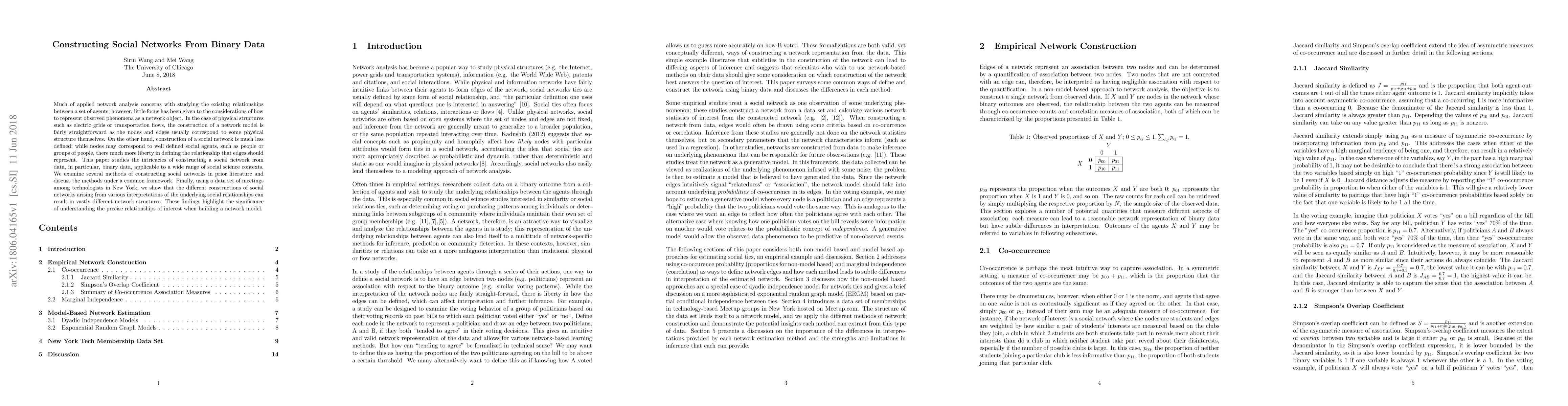 Researchers studied how to construct social networks from binary data and found that different interpretations of relationships can result in vastly different network structures. This highlights the importance of understanding precise relationships when building a network model.