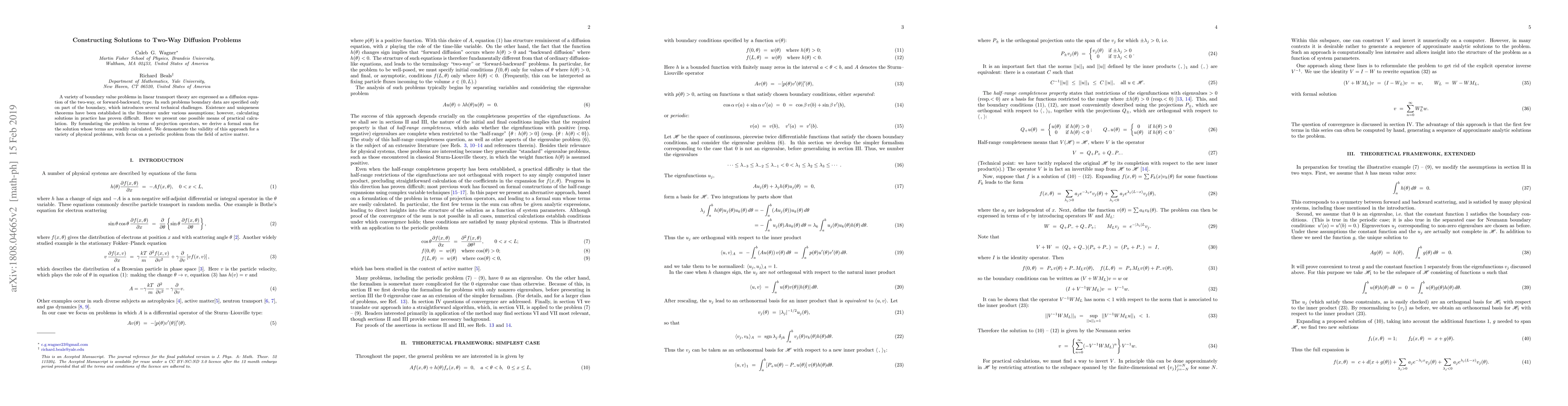 A variety of boundary value problems in linear transport theory are expressed as a diffusion equation of the two-way, or forward-backward, type. In such problems boundary data are specified only on part of the boundary, which introduces several technical challenges. Existence and uniqueness theorems have been established in the literature under various assumptions; however, calculating solutions in practice has proven difficult. Here we present one possible means of practical calculation. By formulating the problem in terms of projection operators, we derive a formal sum for the solution whose terms are readily calculated. We demonstrate the validity of this approach for a variety of physical problems, with focus on a periodic problem from the field of active matter.