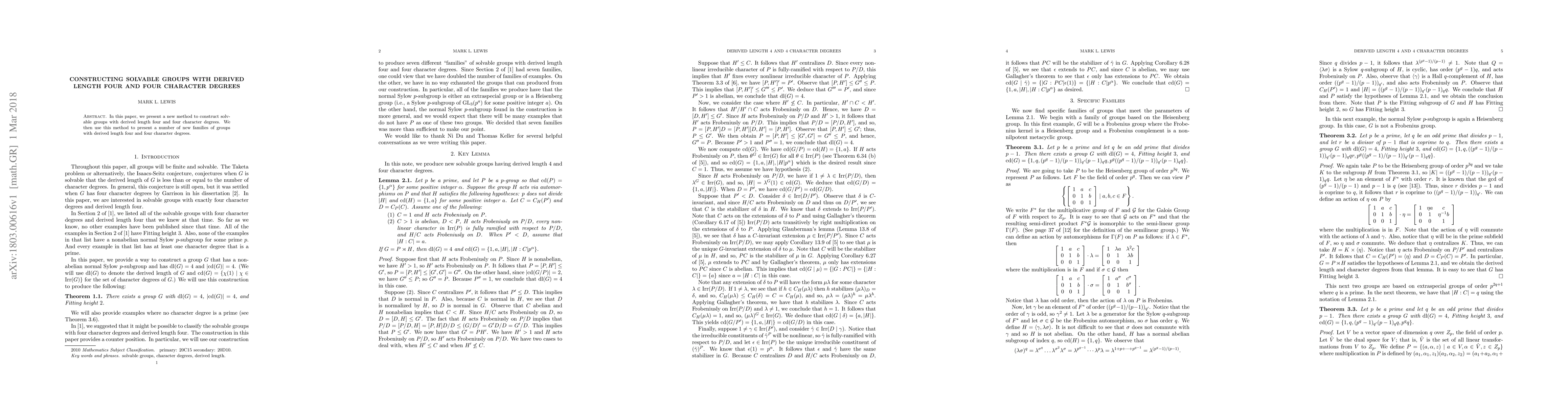 This paper introduces a novel technique for constructing solvable groups with a derived length of four and four distinct character degrees, and applies this method to generate several new families of such groups.