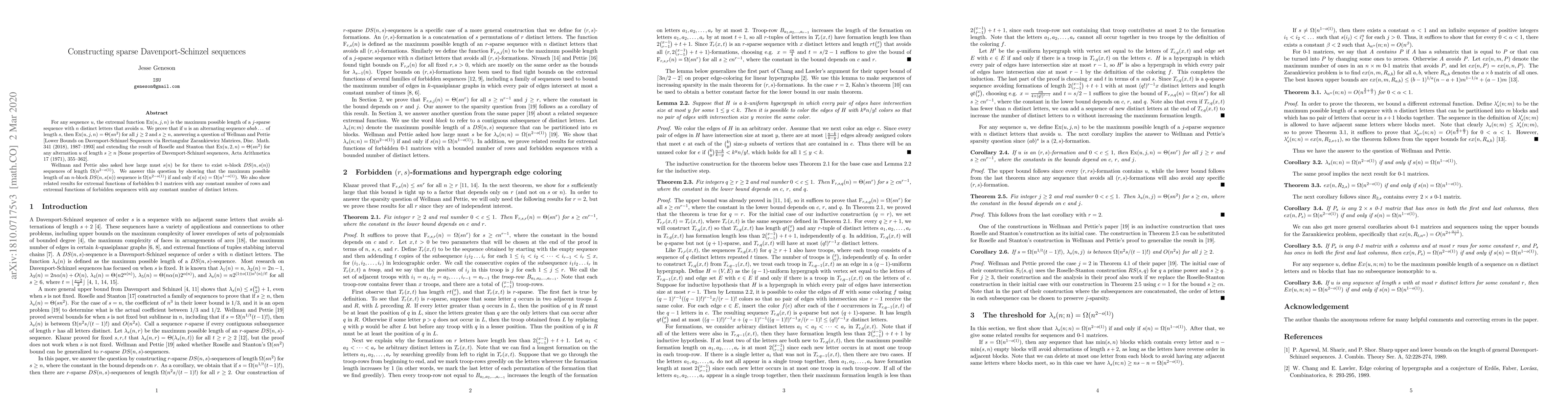 This paper establishes that for an alternating sequence $u$ of length $s$, the extremal function $Ex(u, j, n)$ for $j \geq 2$ and $s \geq n$ is $\Theta(s n^{2})$. It answers previous inquiries regarding the length of Davenport-Schinzel sequences and forbidden 0-1 matrices, showing that $s(n)$ must be $\Omega(n^{1-o(1)})$ for sequences of length $\Omega(n^{2-o(1)})$.