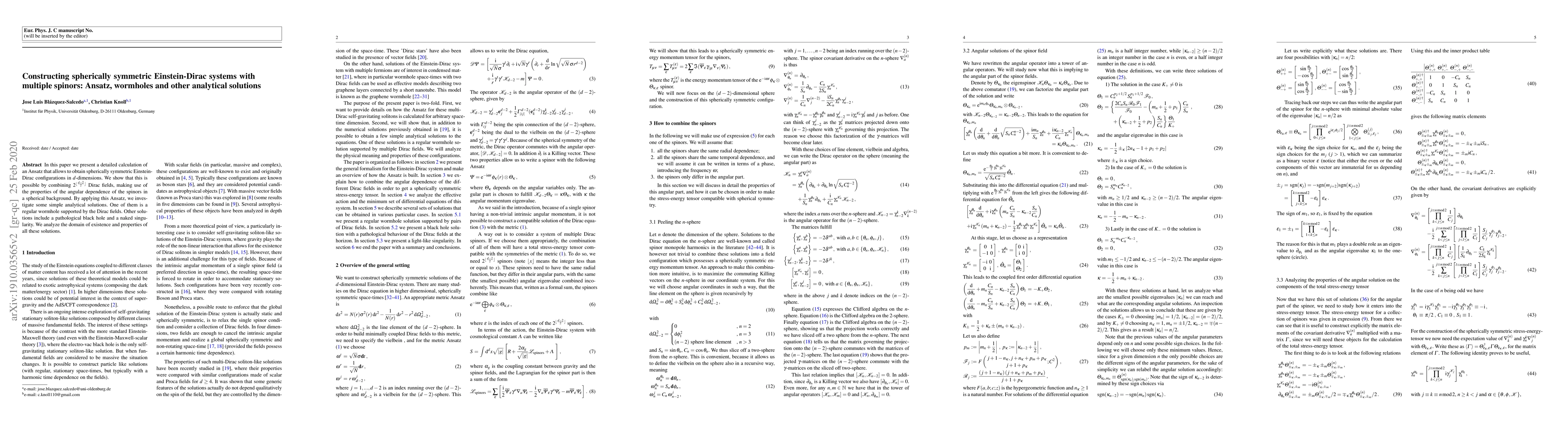 This paper develops an Ansatz to construct spherically symmetric Einstein-Dirac systems in $d$-dimensions using $2^{\lfloor \frac{d-2}{2} \rfloor}$ Dirac fields. It explores analytical solutions, including a regular wormhole, a pathological black hole, and a naked singularity, analyzing their domains and properties.