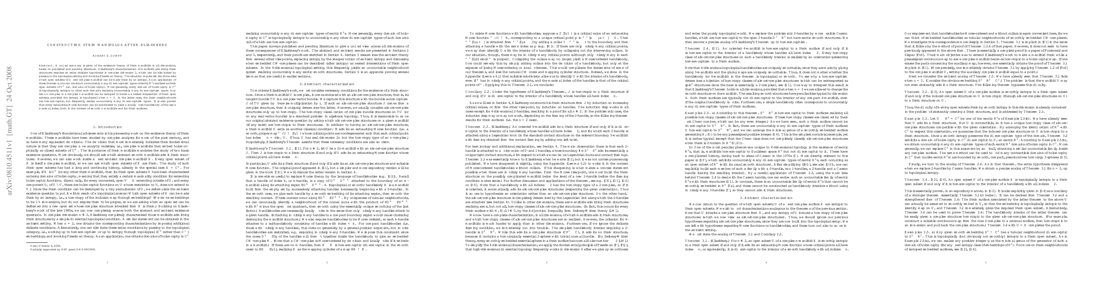 A unified summary is given of the existence theory of Stein manifolds in all dimensions, based on published and pending literature. Eliashberg's characterization of manifolds admitting Stein structures requires an extra delicate hypothesis in complex dimension 2, which can be eliminated by passing to the topological setting and invoking Freedman theory. The situation is quite similar if one asks which open subsets of a fixed complex manifold can be made Stein by an isotopy. As an application of these theorems, one can construct uncountably many diffeomorphism types of exotic R^4's realized as Stein open subsets of C^2 (i.e. domains of holomorphy). More generally, every domain of holomorphy in C^2 is topologically isotopic to other such domains realizing uncountably many diffeomorphism types. Any tame n-complex in a complex n-manifold can be isotoped to become a nested intersection of Stein open subsets, provided the isotopy is topological when n=2. In the latter case, the Stein neighborhoods are homeomorphic, but frequently realize uncountably many diffeomorphism types. It is also proved that every exhausting Morse function can be subdivided to yield a locally finite handlebody of the same maximal index, both in the context of smooth n-manifolds and for Stein surfaces.