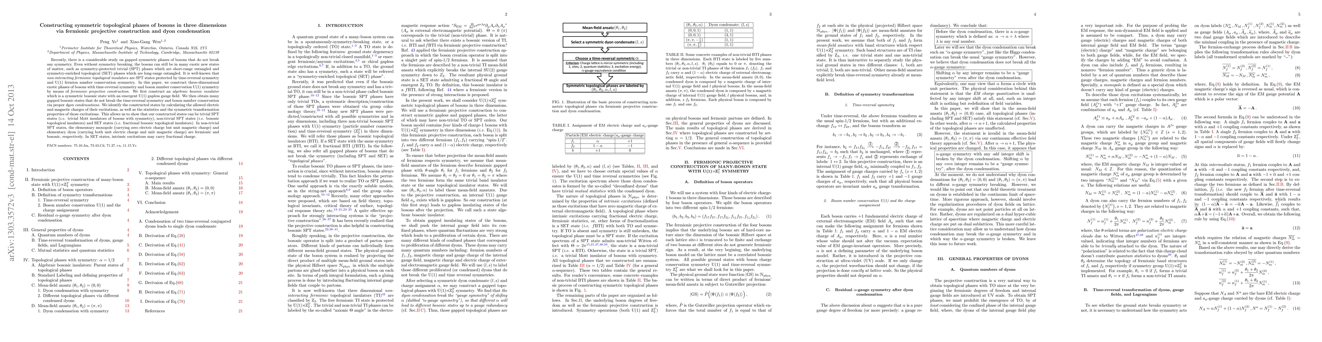 This paper constructs three-dimensional bosonic phases with time-reversal symmetry and U(1) boson number conservation, using fermionic projective construction and dyon condensation. It identifies these phases as trivial SPT, non-trivial SPT, and SET states based on their excitations' charges and statistics.