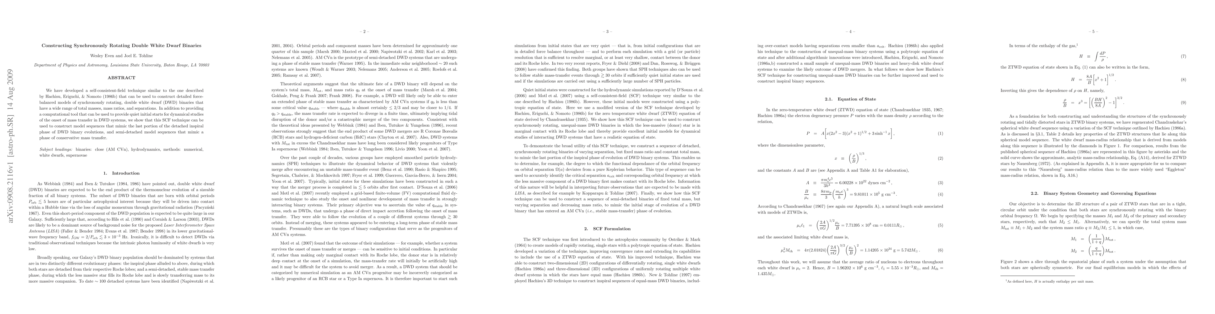 The research employs a self-consistent-field (SCF) technique to construct detailed force-balanced models of synchronously rotating double white dwarf (DWD) binaries, covering a range of total masses, mass ratios, and separations.