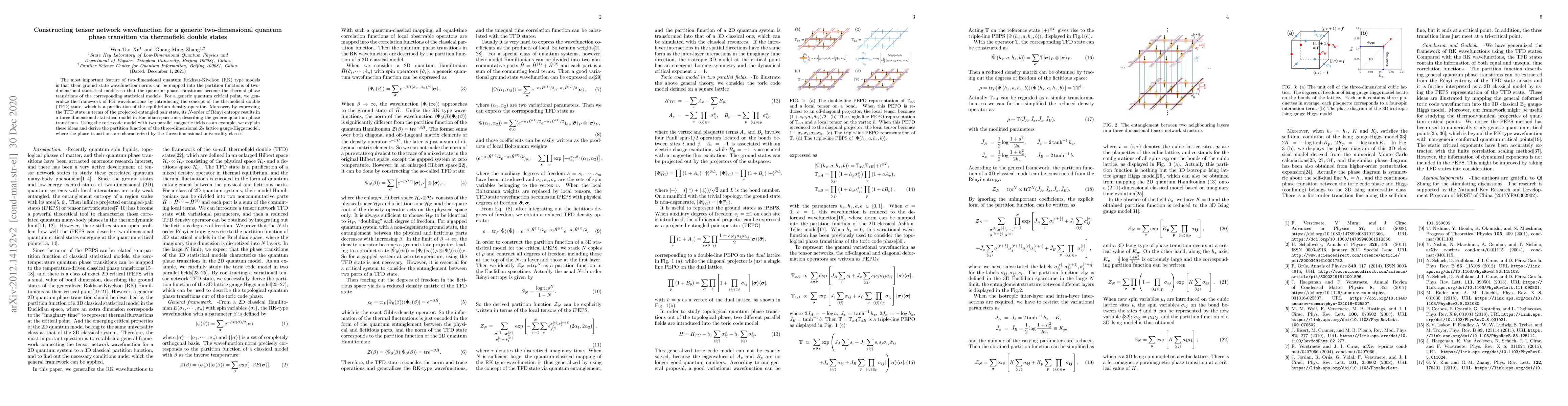 The most important feature of two-dimensional quantum Rokhsar-Kivelson (RK) type models is that their ground state wavefunction norms can be mapped into the partition functions of two-dimensional statistical models so that the quantum phase transitions become the thermal phase transitions of the corresponding statistical models. For a generic quantum critical point, we generalize the framework of RK wavefunctions by introducing the concept of the thermofield double (TFD) state, which is a purification of the equilibrium density operator. Moreover, by expressing the TFD state in terms of the projected entangled pair state, its $N$-order of R\'{e}nyi entropy results in a three-dimensional statistical model in Euclidian spacetime, describing the generic quantum phase transitions. Using the toric code model with two parallel magnetic fields as an example, we explain these ideas and derive the partition function of the three-dimensional $Z_2$ lattice gauge-Higgs model, where the phase transitions are characterized by the three-dimensional universality classes.
