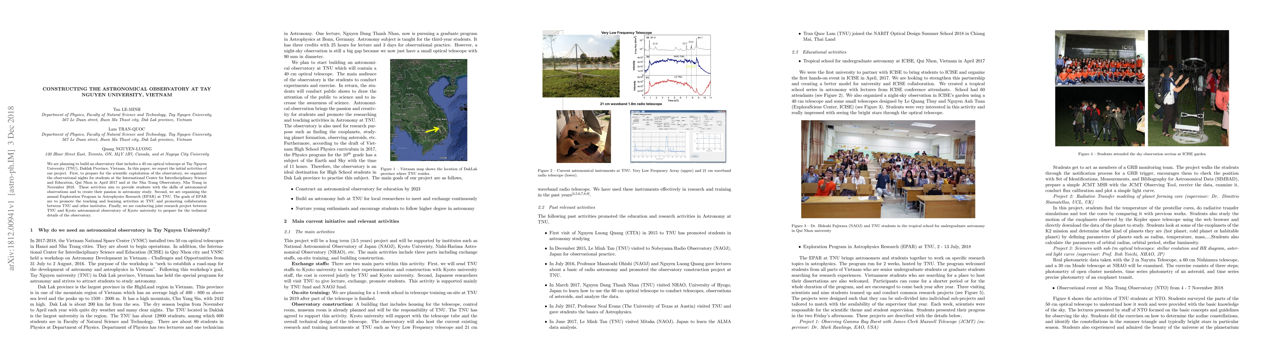 We are planning to build an observatory that includes a 40 cm optical telescope at Tay Nguyen University (TNU), Daklak Province, Vietnam. In this paper, we report the initial activities of our project. First, to prepare for the scientific exploitation of the observatory, we organized the observational nights for students at the International Center for Interdisciplinary Science and Education, Qui Nhon in April 2017 and at the Nha Trang Observatory, Nha Trang in November 2018. These activities aim to provide students with the skills of astronomical observations and to create their passion in astronomy study. Second, we are organizing the annual Exploration Program in Astrophysics Research (EPAR) at TNU. The goals of EPAR are to promote the teaching and learning activities at TNU and promoting collaboration between TNU and other institutes. Finally, we are conducting joint research project between TNU and Kyoto astronomical observatory of Kyoto university to prepare for the technical details of the observatory.