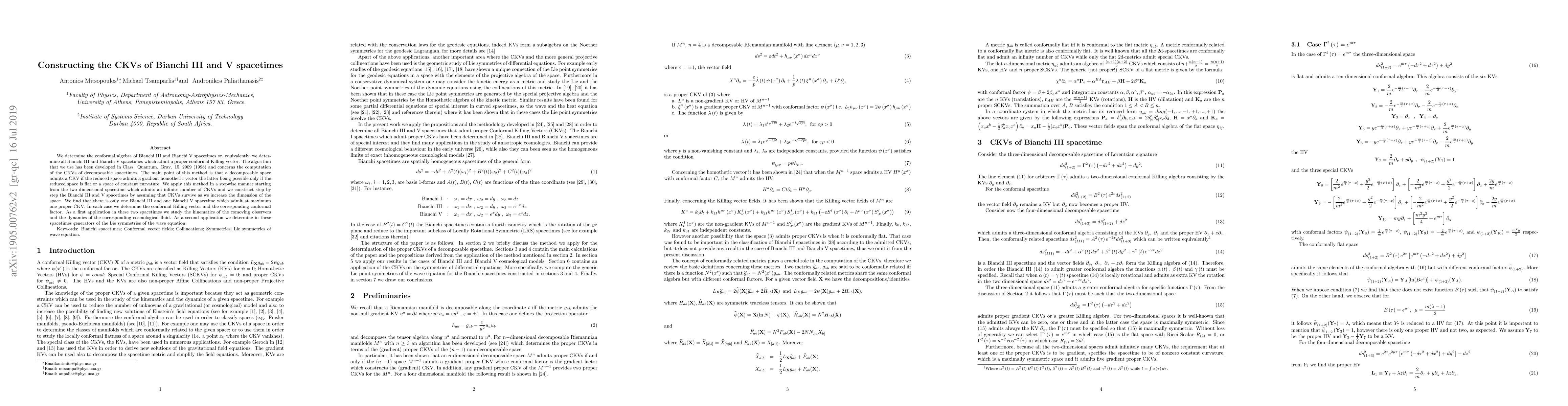 This research identifies the conformal Killing vectors (CKVs) for Bianchi III and V spacetimes using an algorithmic method. It finds that only one spacetime of each type admits at most one proper CKV, determining the corresponding CKV and factor, and also explores the kinematics of comoving observers and symmetries of the wave equation in these spacetimes.