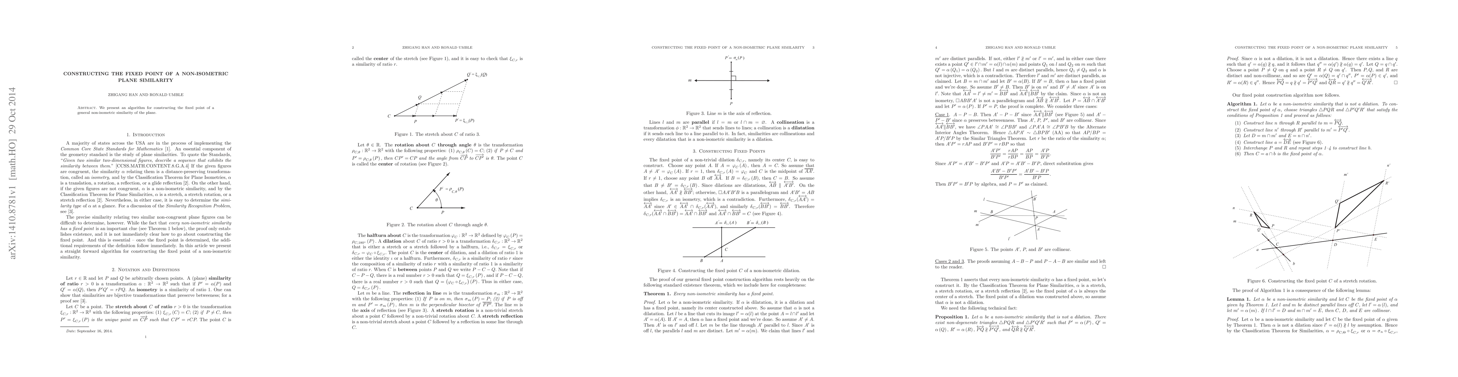 Summary: This paper introduces an algorithm to determine the fixed point of a non-isometric plane similarity transformation. The method provides a systematic approach to solving this geometric problem.