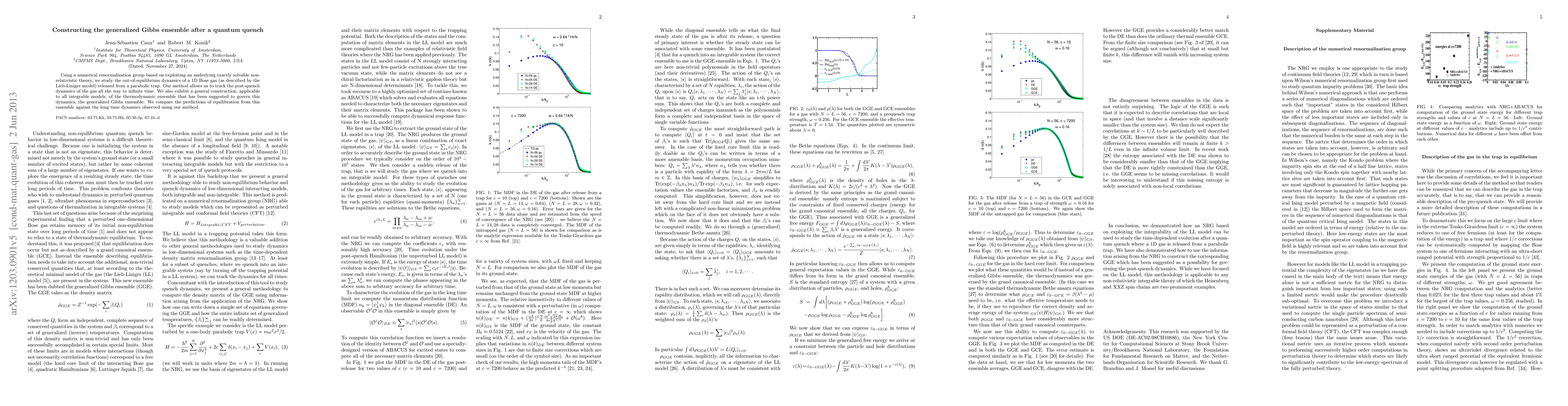 This paper develops a numerical method to study the out-of-equilibrium dynamics of a 1D Bose gas after a quantum quench, using the Lieb-Liniger model. It also constructs the generalized Gibbs ensemble for integrable models, comparing its predictions with observed dynamics.