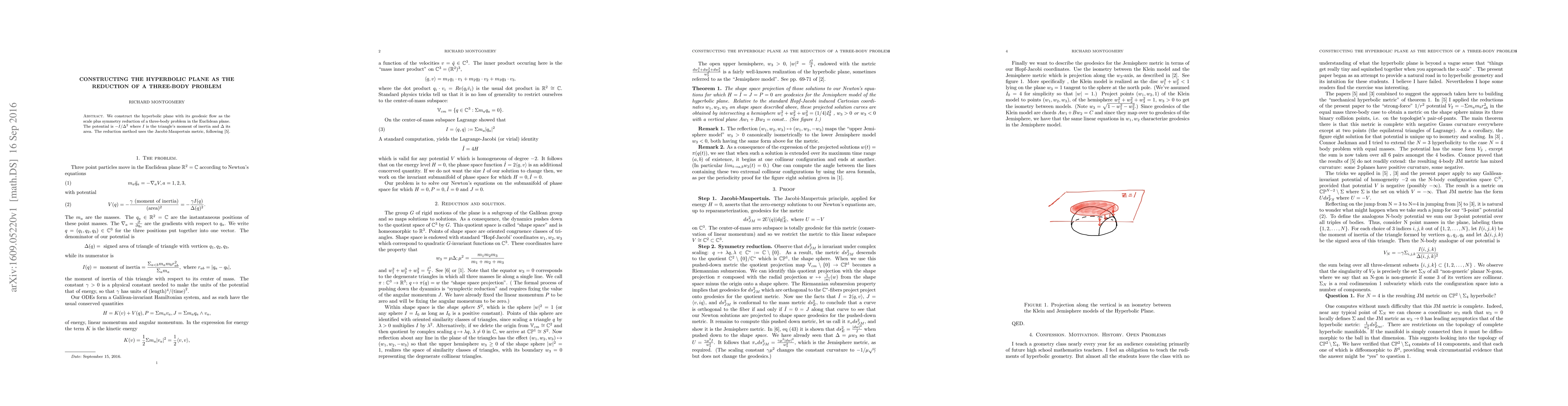 We construct the hyperbolic plane with its geodesic flow as the scale plus symmetry reduction of a three-body problem in the Euclidean plane. The potential is $-I/\Delta^2$ where $I$ is the triangle's moment of inertia and $\Delta$ its area. The reduction method uses the Jacobi-Maupertuis metric, following the author's earlier paper "Putting Hyperbolic Pants on a Three-body Problem".