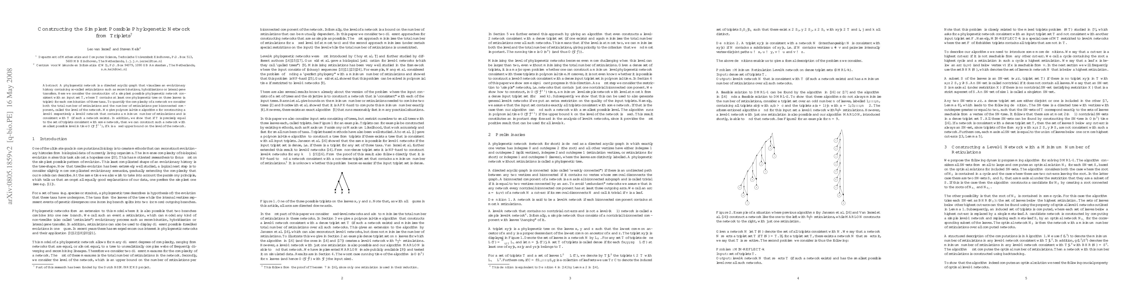 This paper presents algorithms for constructing the simplest phylogenetic network from a set of triplets, minimizing both the total number of reticulations and the network's level. It provides polynomial-time solutions for level-1 and level-2 networks and discusses the complexity when the input triplet set matches a specific network's triplets.