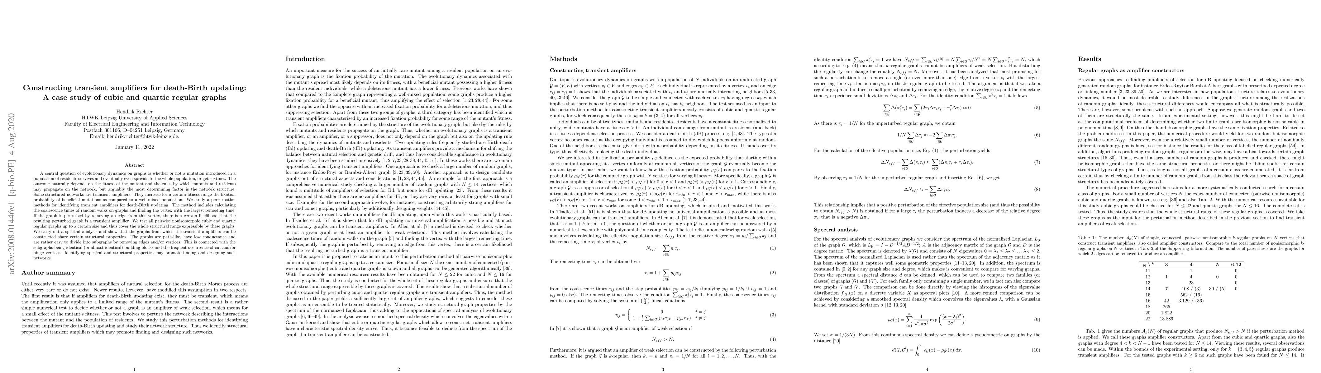 A central question of evolutionary dynamics on graphs is whether or not a mutation introduced in a population of residents survives and eventually even spreads to the whole population, or gets extinct. The outcome naturally depends on the fitness of the mutant and the rules by which mutants and residents may propagate on the network, but arguably the most determining factor is the network structure. Some structured networks are transient amplifiers. They increase for a certain fitness range the fixation probability of beneficial mutations as compared to a well-mixed population. We study a perturbation methods for identifying transient amplifiers for death-Birth updating. The method includes calculating the coalescence times of random walks on graphs and finding the vertex with the largest remeeting time. If the graph is perturbed by removing an edge from this vertex, there is a certain likelihood that the resulting perturbed graph is a transient amplifier. We test all pairwise nonisomorphic cubic and quartic regular graphs up to a certain size and thus cover the whole structural range expressible by these graphs. We carry out a spectral analysis and show that the graphs from which the transient amplifiers can be constructed share certain structural properties. The graphs are path-like, have low conductance and are rather easy to divide into subgraphs by removing edges and/or vertices. This is connected with the subgraphs being identical (or almost identical) building blocks and the frequent occurrence of cut and/or hinge vertices. Identifying spectral and structural properties may promote finding and designing such networks.