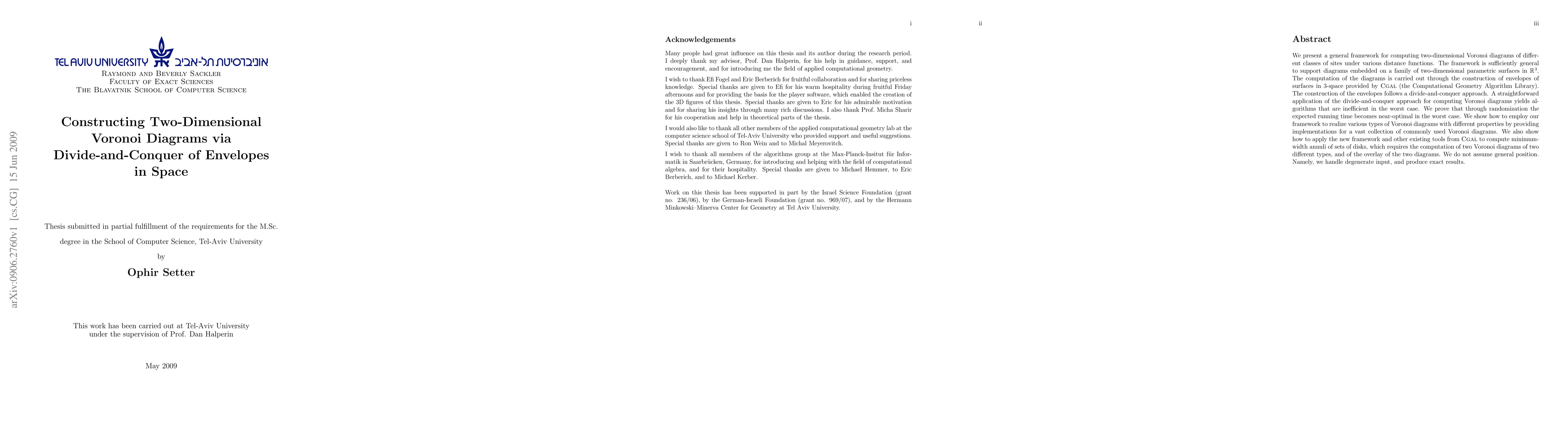 This paper presents a divide-and-conquer approach for computing two-dimensional Voronoi diagrams using envelope construction in 3D space, achieving near-optimal expected running time through randomization. The framework supports various distance functions and handles degenerate inputs to produce exact results.
