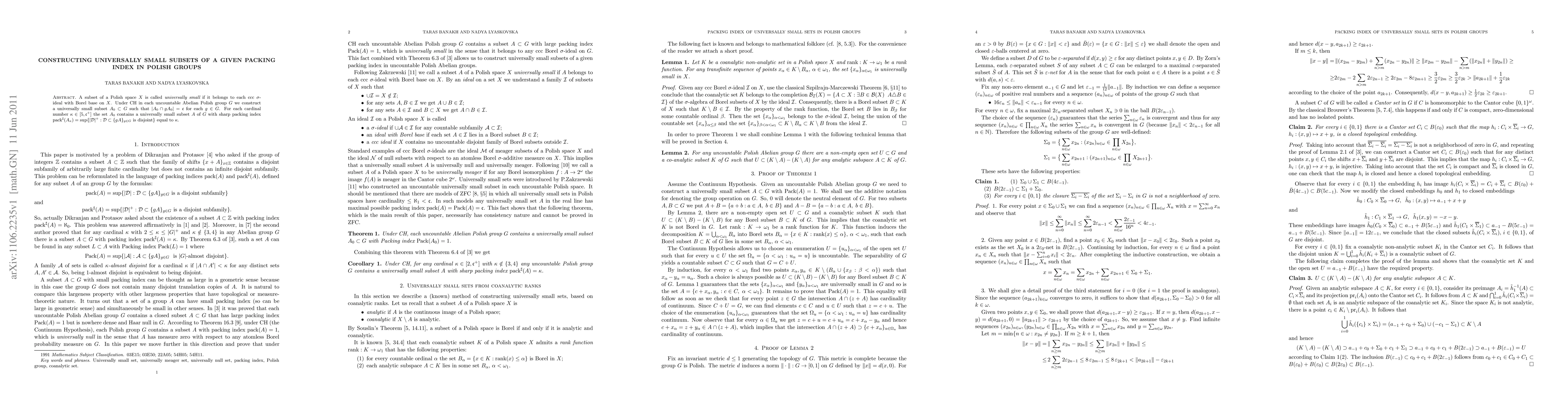 This research constructs universally small subsets in uncountable Abelian Polish groups under the Continuum Hypothesis (CH). It provides a subset A_0 with a specific cardinality of intersections with its translates, and for any cardinal κ in [5, c^+], creates a universally small subset A with a sharp packing index κ.