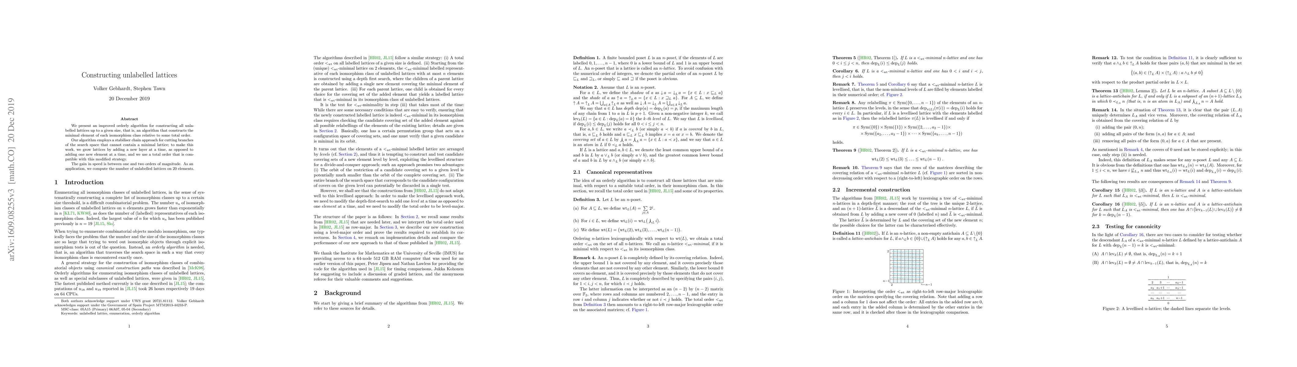 We present an improved orderly algorithm for constructing all unlabelled lattices up to a given size, that is, an algorithm that constructs the minimal element of each isomorphism class relative to some total order. Our algorithm employs a stabiliser chain approach for cutting branches of the search space that cannot contain a minimal lattice; to make this work, we grow lattices by adding a new layer at a time, as opposed to adding one new element at a time, and we use a total order that is compatible with this modified strategy. The gain in speed is between one and two orders of magnitude. As an application, we compute the number of unlabelled lattices on 20 elements.