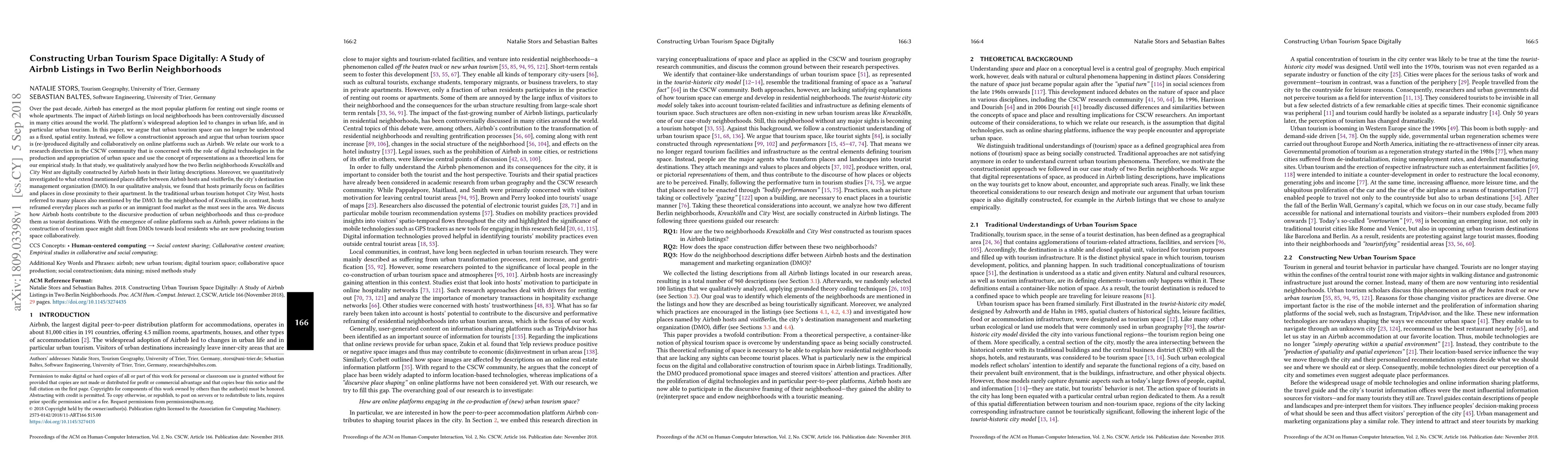 Over the past decade, Airbnb has emerged as the most popular platform for renting out single rooms or whole apartments. The impact of Airbnb listings on local neighborhoods has been controversially discussed in many cities around the world. The platform's widespread adoption led to changes in urban life, and in particular urban tourism. We argue that urban tourism space can no longer be understood as a fixed, spatial entity. Instead, we follow a constructionist approach and argue that urban tourism space is (re-)produced digitally and collaboratively on online platforms such as Airbnb. We relate our work to a CSCW research direction that is concerned with the role of digital technologies in the production and appropriation of urban space and use the concept of representations as a theoretical lens for our empirical study. In that study, we qualitatively analyzed how the two Berlin neighborhoods Kreuzk\"olln and City West are digitally constructed by Airbnb hosts in their listing descriptions. Moreover, we quantitatively investigated to what extend mentioned places differ between Airbnb hosts and visitBerlin, the city's destination management organization (DMO). In our qualitative analysis, we found that hosts primarily focus on facilities and places in close proximity to their apartment. In the traditional urban tourism hotspot City West, hosts referred to many places also mentioned by the DMO. In the neighborhood of Kreuzk\"olln, in contrast, hosts reframed everyday places such as parks or an immigrant food market as the must sees in the area. We discuss how Airbnb hosts contribute to the discursive production of urban neighborhoods and thus co-produce them as tourist destinations. With the emergence of online platforms such as Airbnb, power relations in the construction of tourism space might shift from DMOs towards local residents who are now producing tourism space collaboratively.