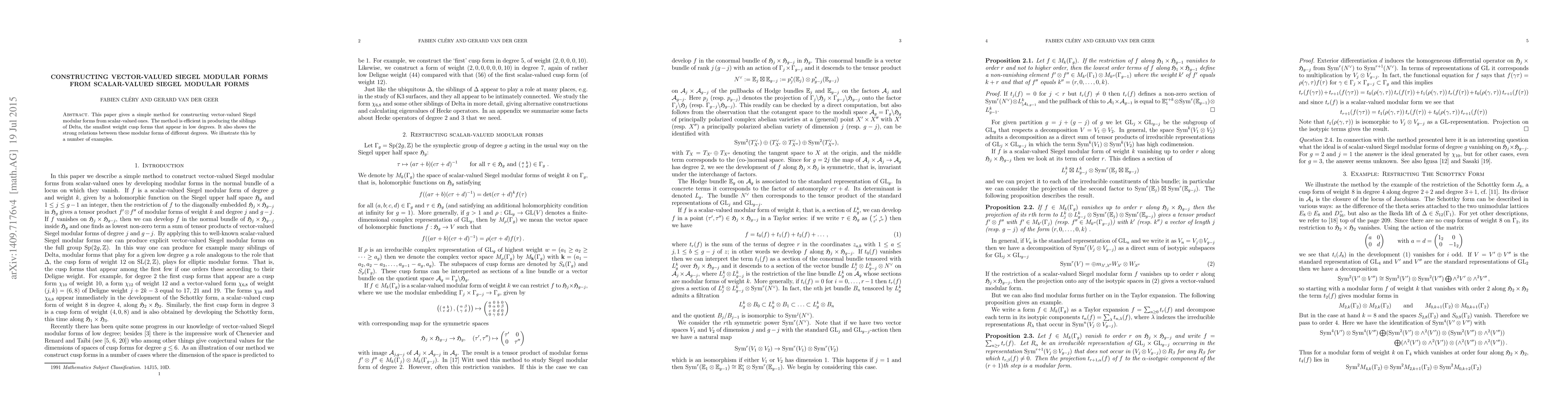 This paper presents an efficient method to construct vector-valued Siegel modular forms from scalar-valued ones, particularly focusing on the siblings of Delta, and demonstrates strong interrelations between modular forms of different genera with several examples.