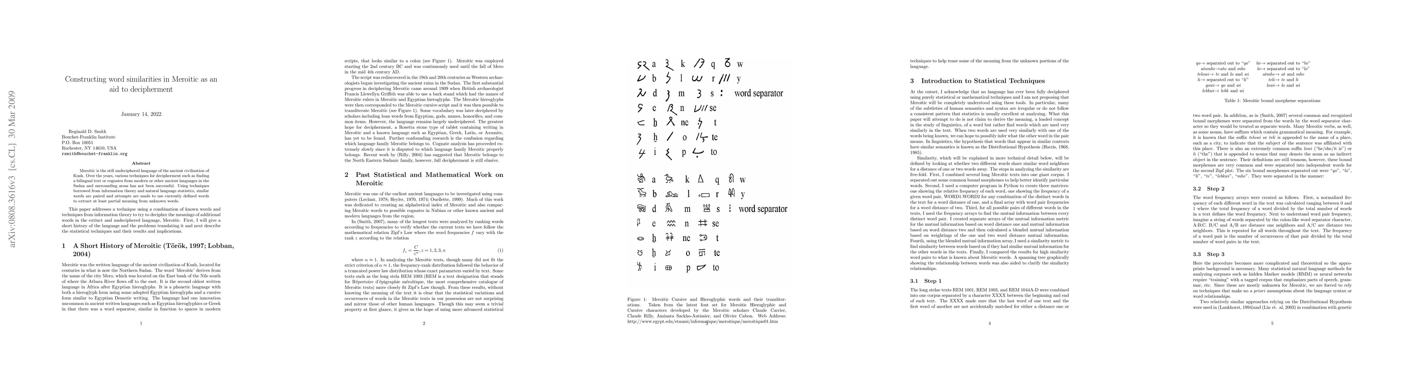Meroitic is the still undeciphered language of the ancient civilization of Kush. Over the years, various techniques for decipherment such as finding a bilingual text or cognates from modern or other ancient languages in the Sudan and surrounding areas has not been successful. Using techniques borrowed from information theory and natural language statistics, similar words are paired and attempts are made to use currently defined words to extract at least partial meaning from unknown words.