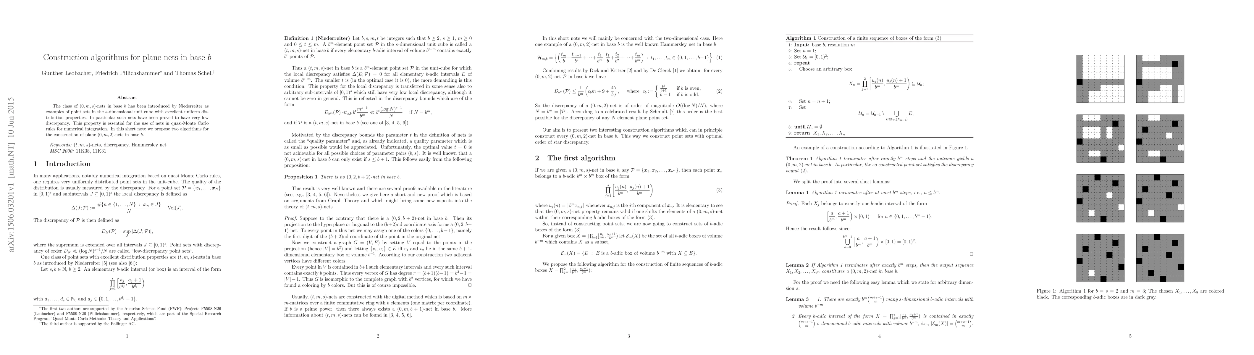 The class of $(0,m,s)$-nets in base $b$ has been introduced by Niederreiter as examples of point sets in the $s$-dimensional unit cube with excellent uniform distribution properties. In particular such nets have been proved to have very low discrepancy. This property is essential for the use of nets in quasi-Monte Carlo rules for numerical integration. In this short note we propose two algorithms for the construction of plane $(0,m,2)$-nets in base~$b$.