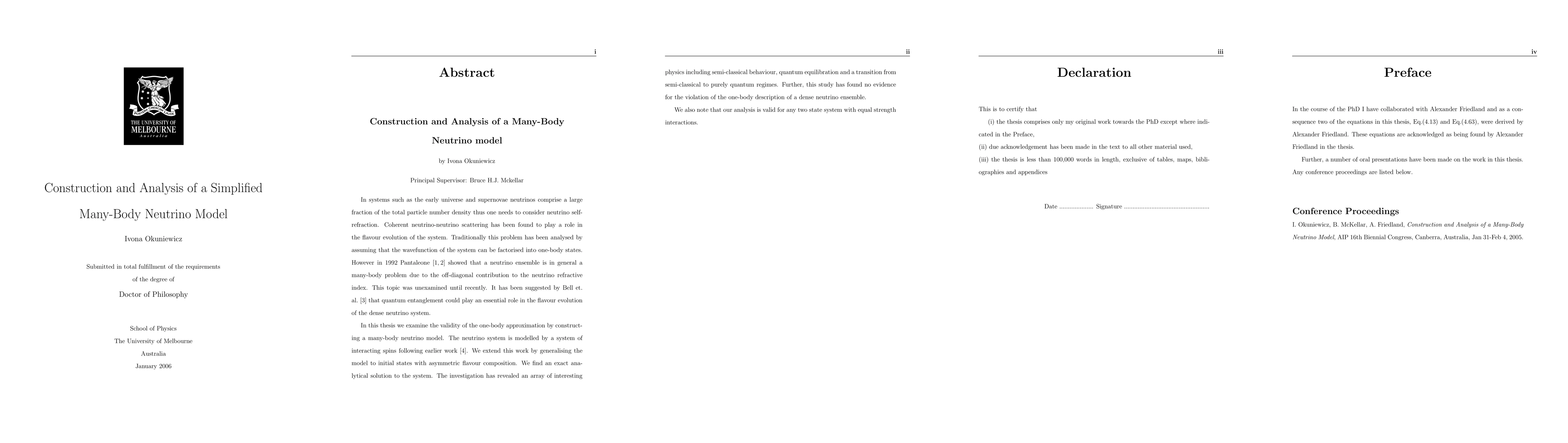 In systems such as the early universe and supernova neutrinos comprise a large fraction of the total particle number density thus one needs to consider neutrino self-refraction. Coherent neutrino-neutrino scattering has been found to play a role in the flavour evolution of the system. Traditionally this problem has been analysed by assuming that the wavefunction of the system can be factorised into one-body states. However in 1992 Pantaleone showed that a neutrino ensemble is in general a many-body problem due to the off-diagonal contribution to the neutrino refractive index. This topic was unexamined until recently. It has been suggested by Bell, Rawlinson and Sawyer that quantum entanglement could play an essential role in the flavour evolution of the dense neutrino system. In this thesis we examine the validity of the one-body approximation by constructing a many-body neutrino model. The neutrino system is modelled by a system of interacting spins following earlier work of Friedland and Lunardini. We extend this work by generalising the model to initial states with asymmetric flavour composition. We find an exact analytical solution to the system. The investigation has revealed an array of interesting physics including semi-classical behaviour, quantum equilibration and a transition from semi-classical to purely quantum regimes. Further, this study has found no evidence for the violation of the one-body description of a dense neutrino ensemble. We also note that our analysis is valid for any two state system with equal strength interactions.
