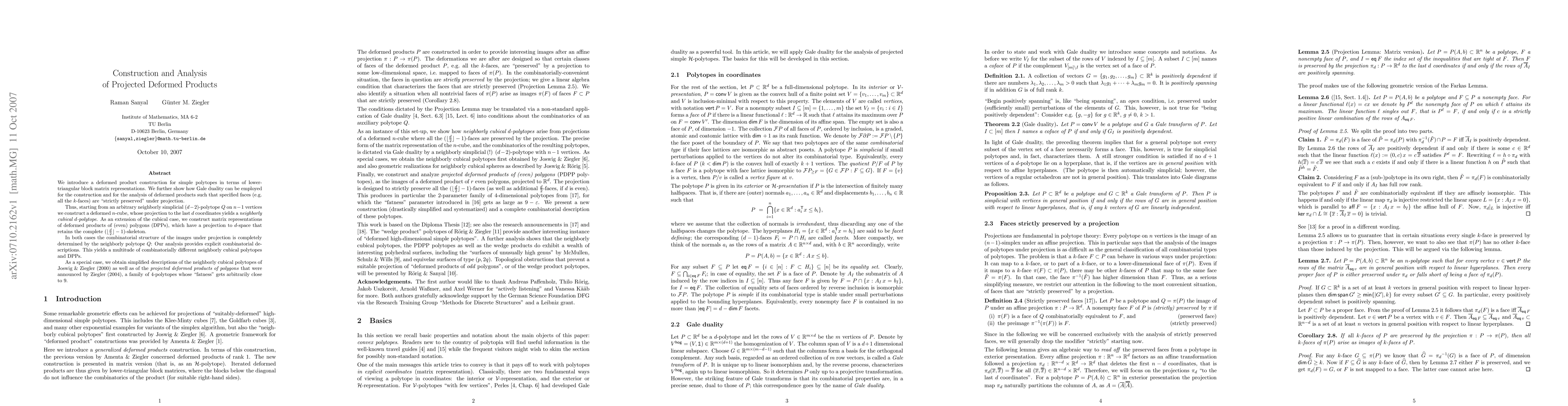 This paper introduces a construction method for deformed products of simple polytopes using lower-triangular block matrices and Gale duality, ensuring that specified faces are preserved under projection. It generates neighborly cubical polytopes and deformed products of polygons with specific combinatorial structures.