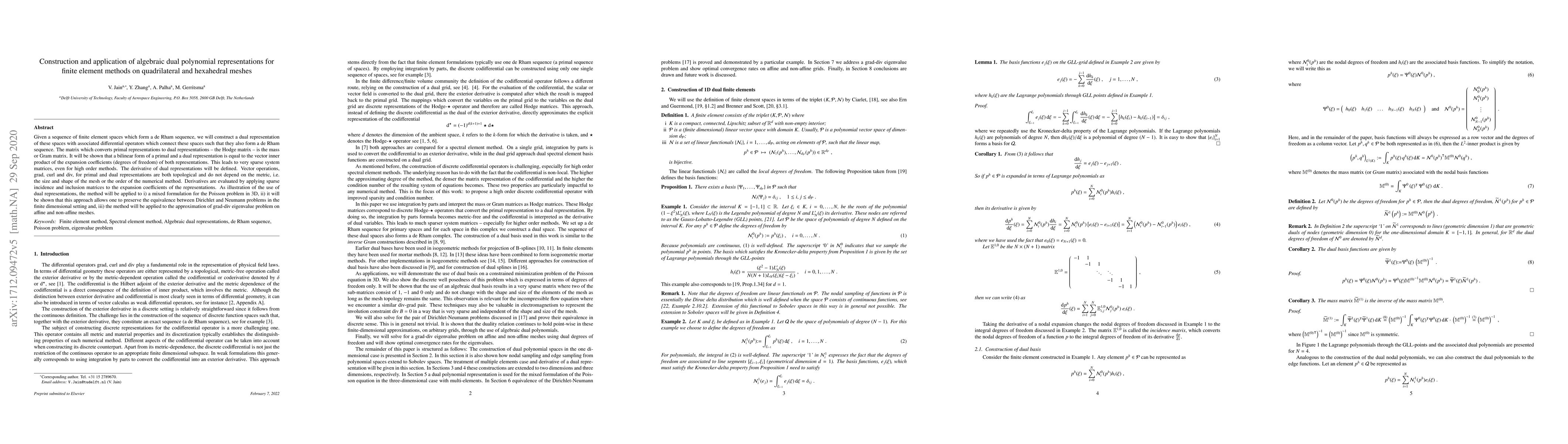 This paper constructs algebraic dual polynomial representations for finite element methods on quadrilateral and hexahedral meshes, forming a de Rham sequence. It demonstrates that these representations lead to sparse system matrices and topological vector operations that are metric-independent, and applies the method to mixed formulations, preserving equivalence between Dirichlet and Neumann problems.