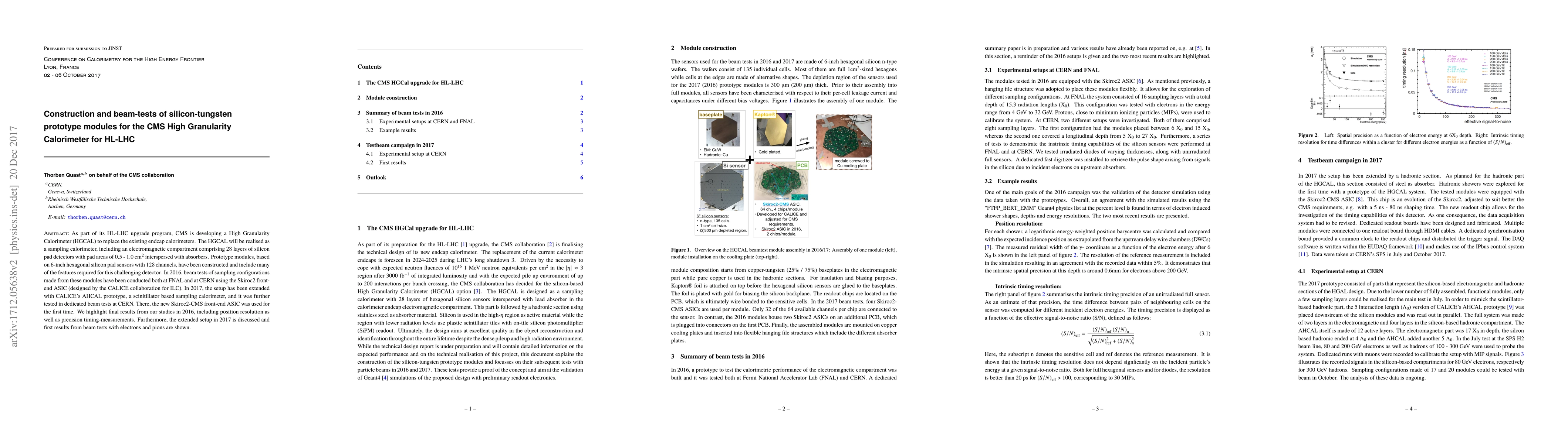This paper details the construction and beam-testing of silicon-tungsten prototype modules for the CMS High Granularity Calorimeter (HGCAL) in preparation for the HL-LHC upgrade. The HGCAL features 28 layers of silicon pad detectors interspersed with tungsten absorbers, with initial tests conducted in 2016 and further extended in 2017 using new front-end ASICs, showcasing position resolution and timing precision.