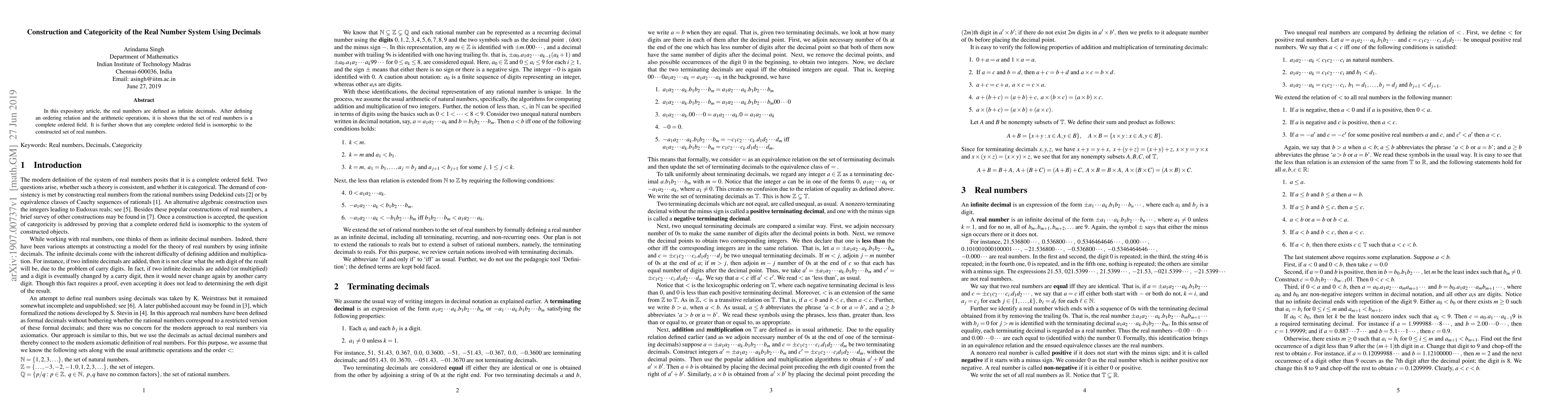 In this expository article, the real numbers are defined as infinite decimals. After defining an ordering relation and the arithmetic operations, it is shown that the set of real numbers is a complete ordered field. It is further shown that any complete ordered field is isomorphic to the constructed set of real numbers.
